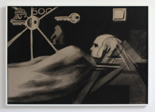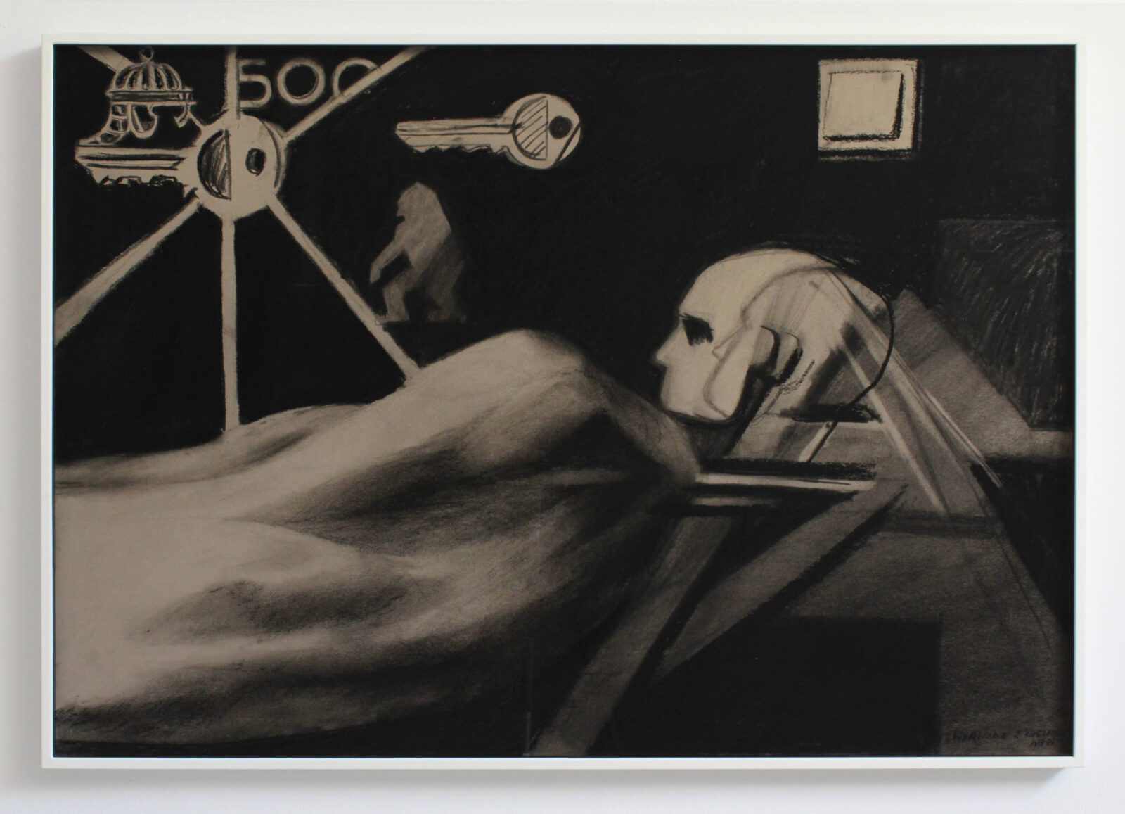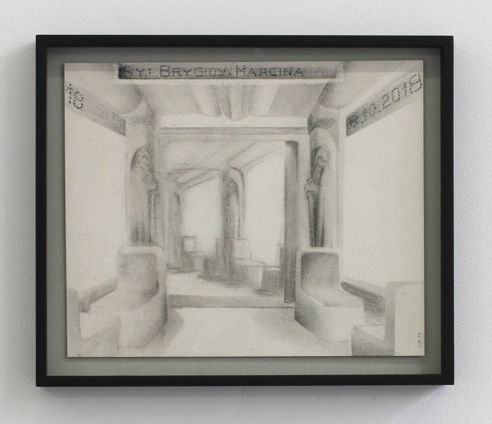 At first, Bąkowski’s site-specific installation here appears understated. A diagonal wall divides the space like an off-set hallway. A suite of framed black-and-white drawings hang on the wall, and a soundtrack plays in the background, complementing the mood. At the center, one of the frames is in fact revealed to be a tinted window through which a dark, constructed scene is visible. Passing by, the window looks like another drawing. But as the space and images beyond the glass challenge the viewer’s perception, the work uncovers itself as a time-based experience, creating a cognitive episode similar to one of Bąkowski’s sound pieces or animations.
