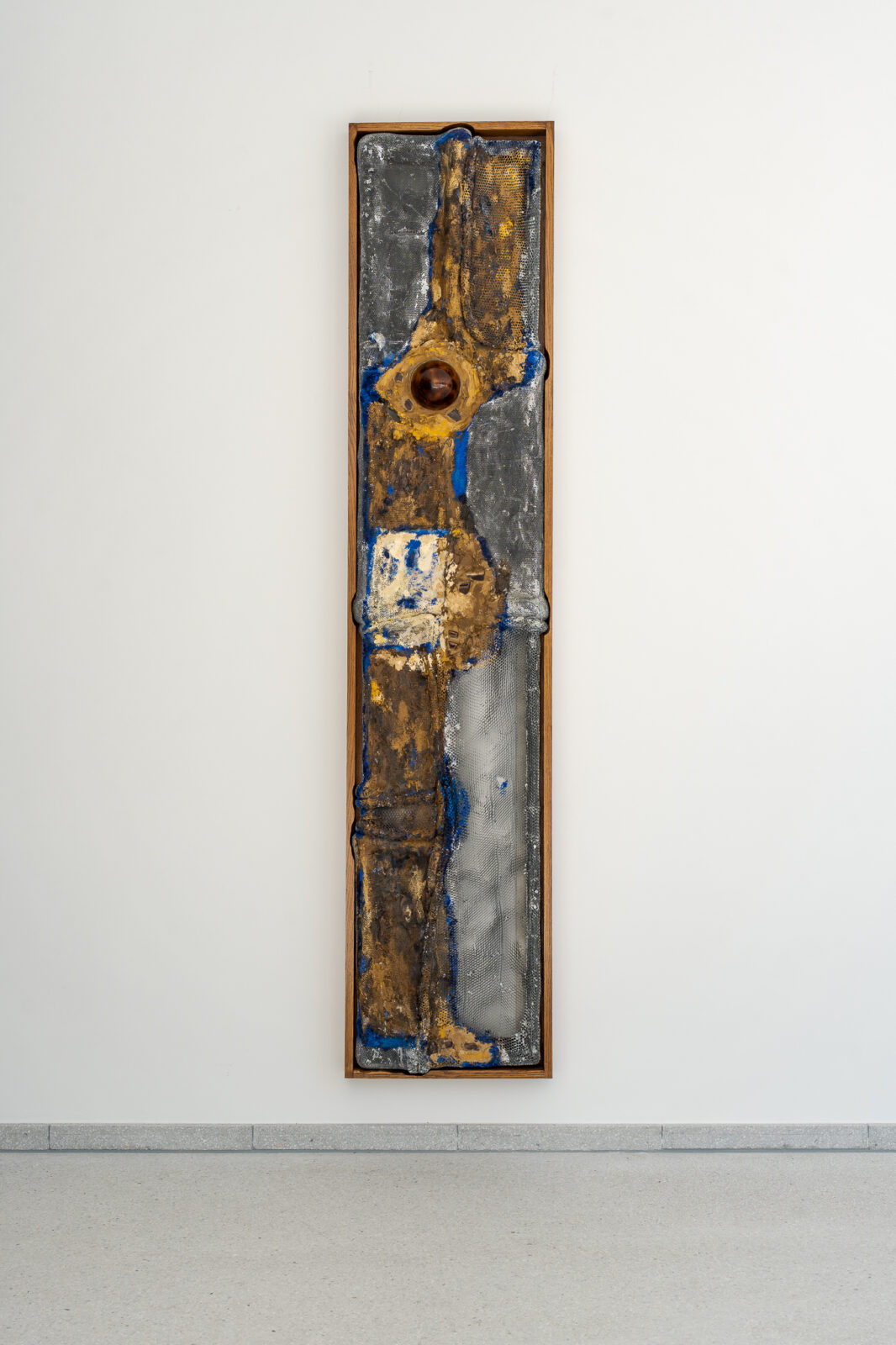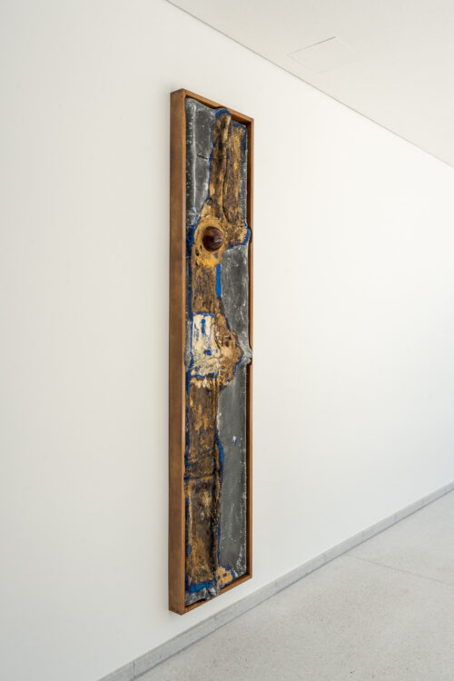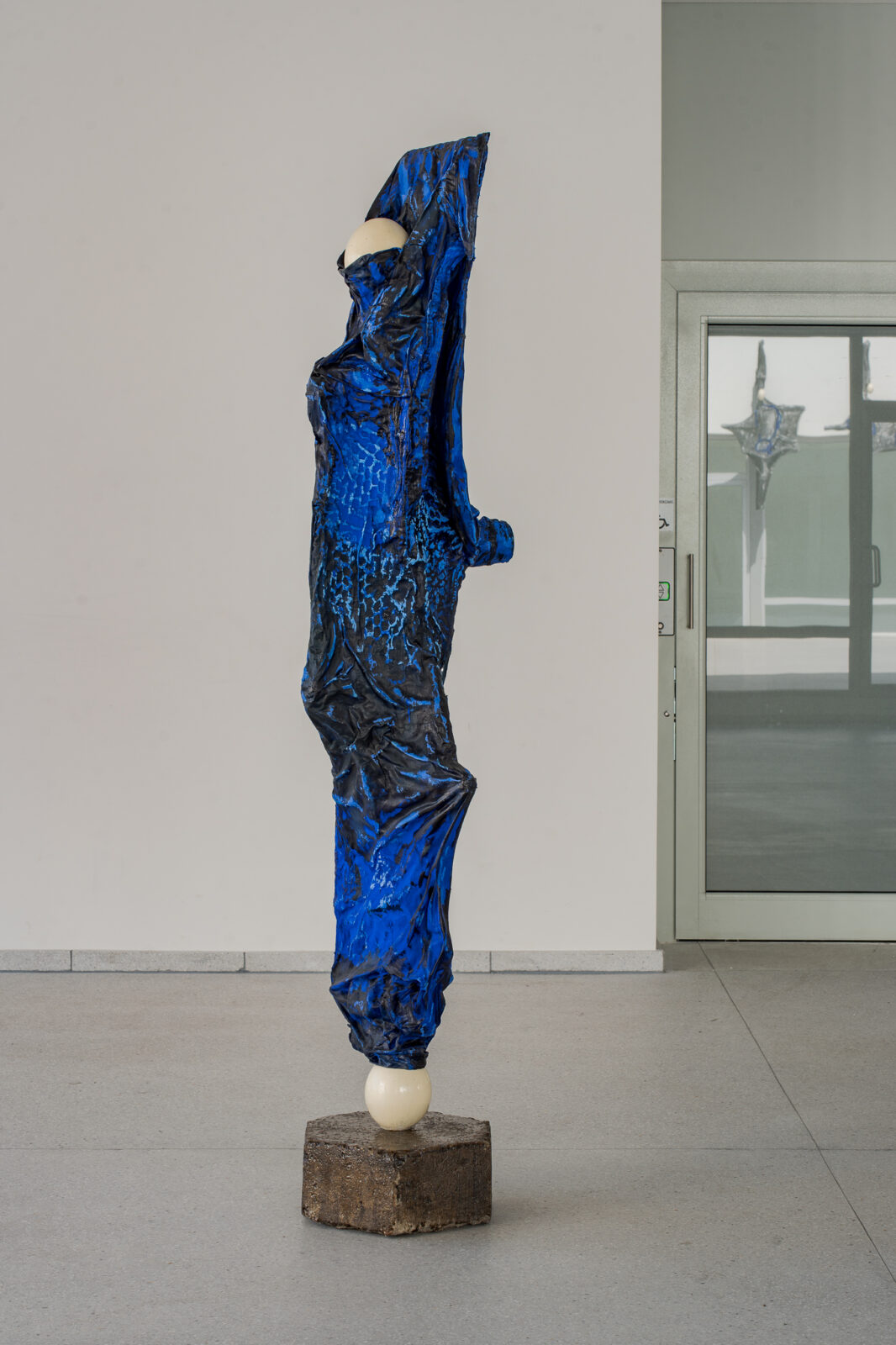 This dynamic also alters how viewers move through the exhibition. The materials – aluminium honeycomb, concrete, wood, oil paint and resin – are shaped into objects from which ostrich eggs protrude, evoking another inner-outer relationship. Their placement across the building generates a tension between immanence and transcendence, encouraging viewers to renegotiate how they perceive the space and to reflect on what these spaces are, beyond calculated measurement.