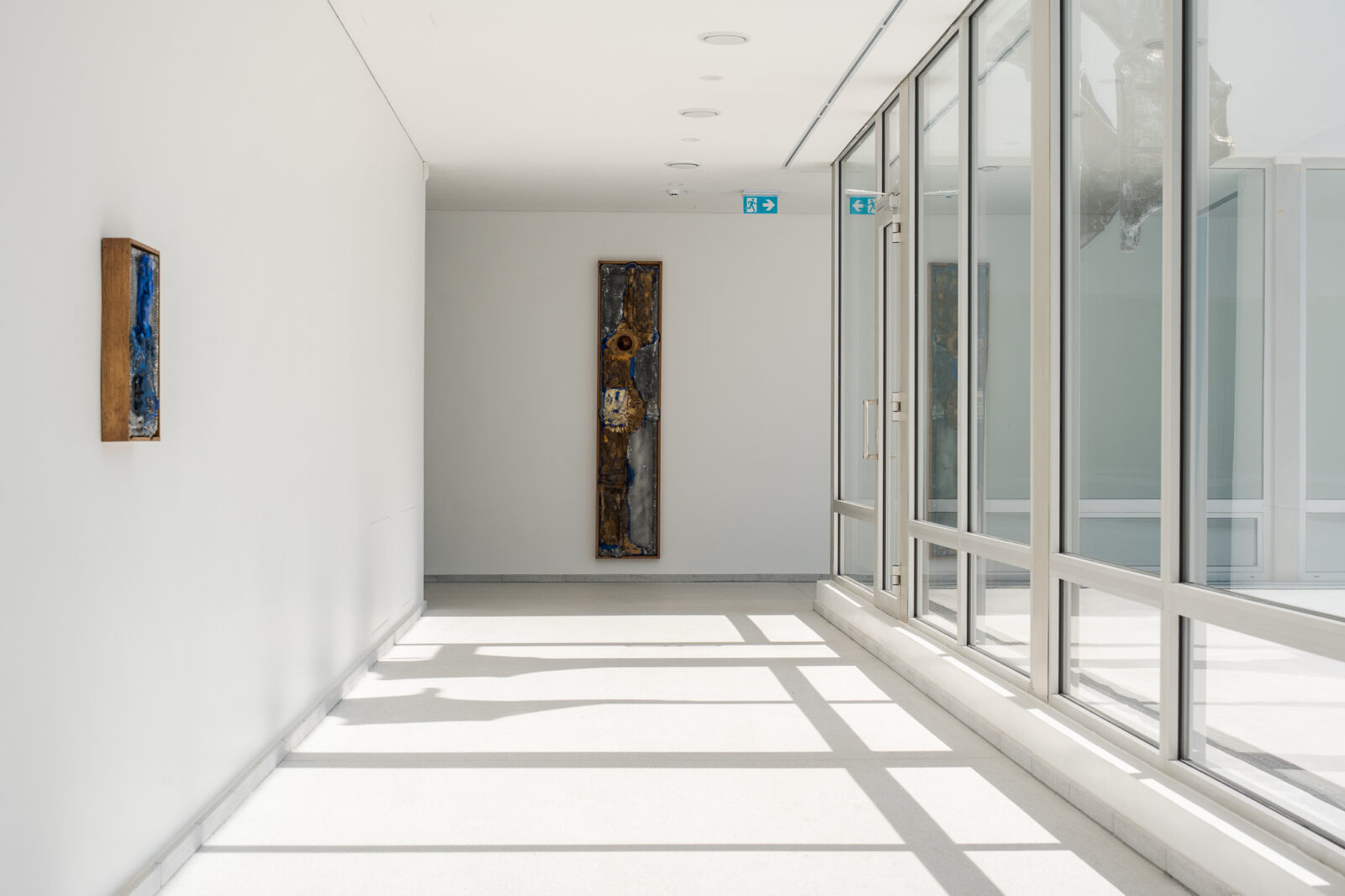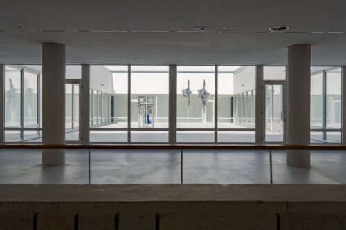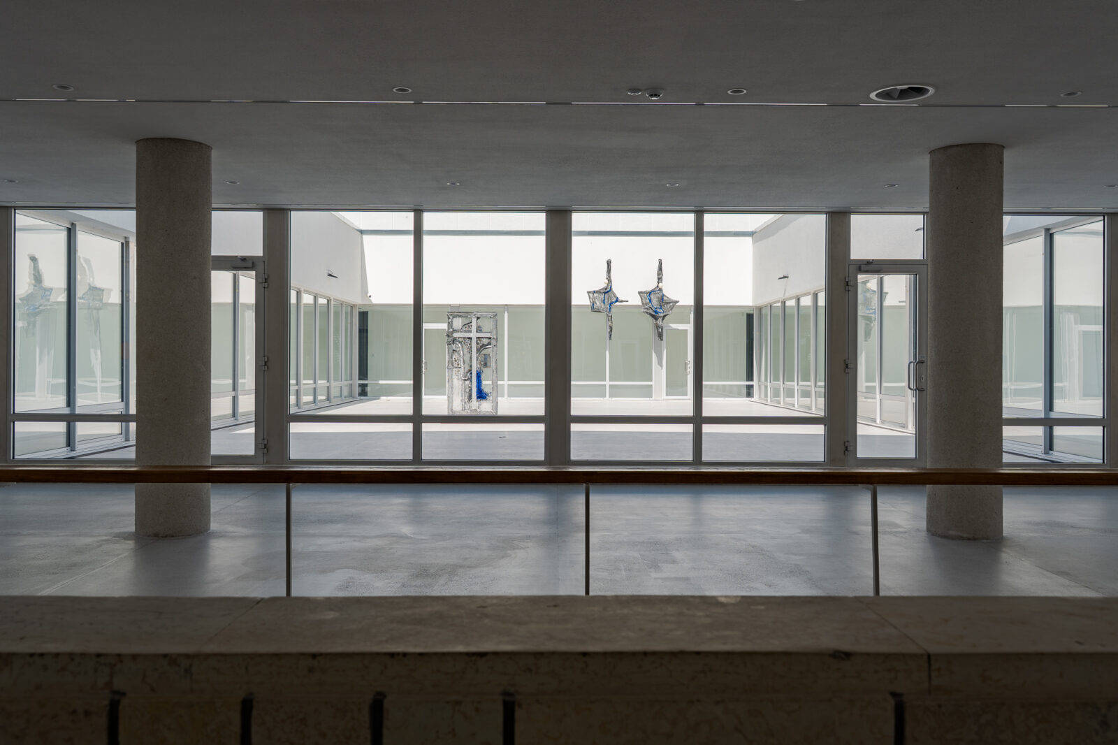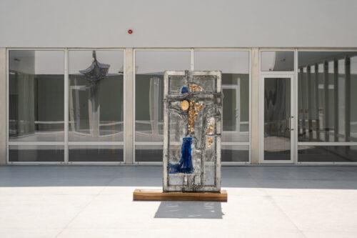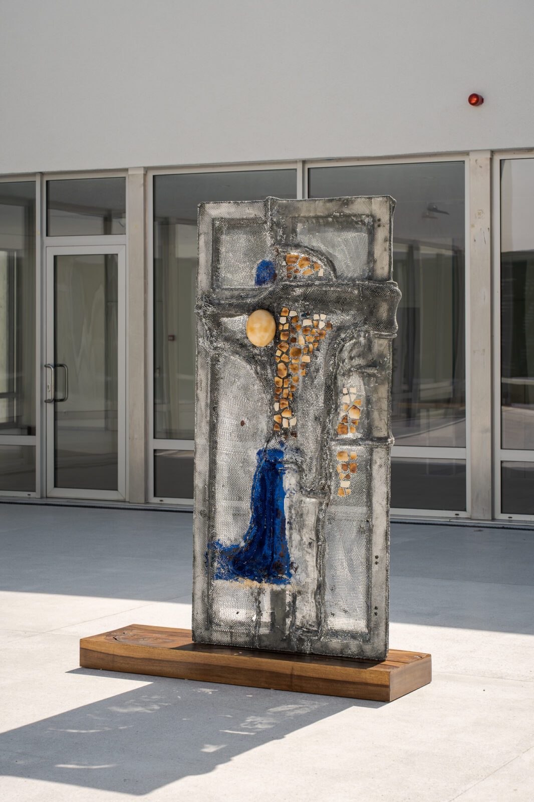 This dynamic also alters how viewers move through the exhibition. The materials – aluminium honeycomb, concrete, wood, oil paint and resin – are shaped into objects from which ostrich eggs protrude, evoking another inner-outer relationship. Their placement across the building generates a tension between immanence and transcendence, encouraging viewers to renegotiate how they perceive the space and to reflect on what these spaces are, beyond calculated measurement.