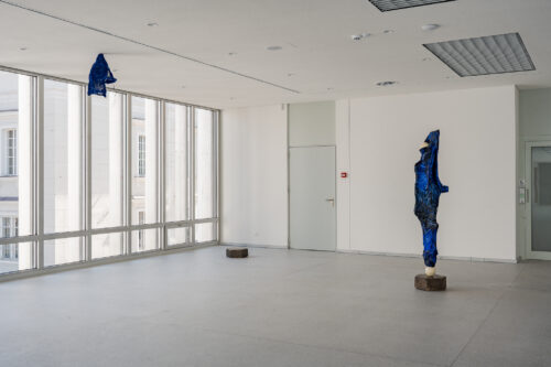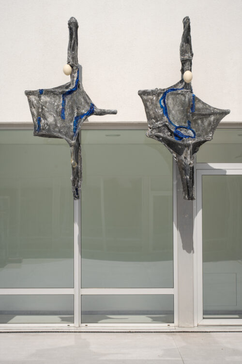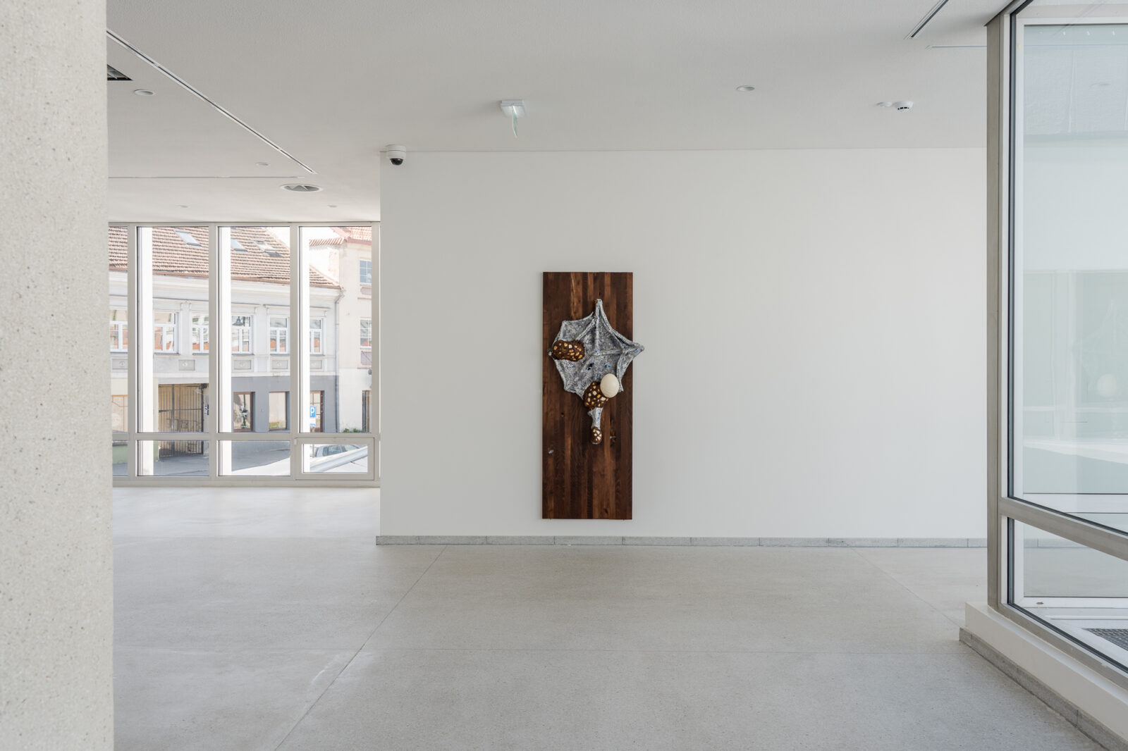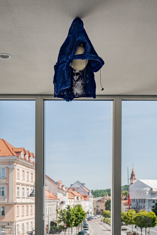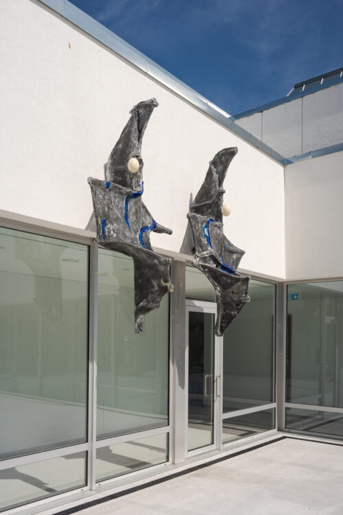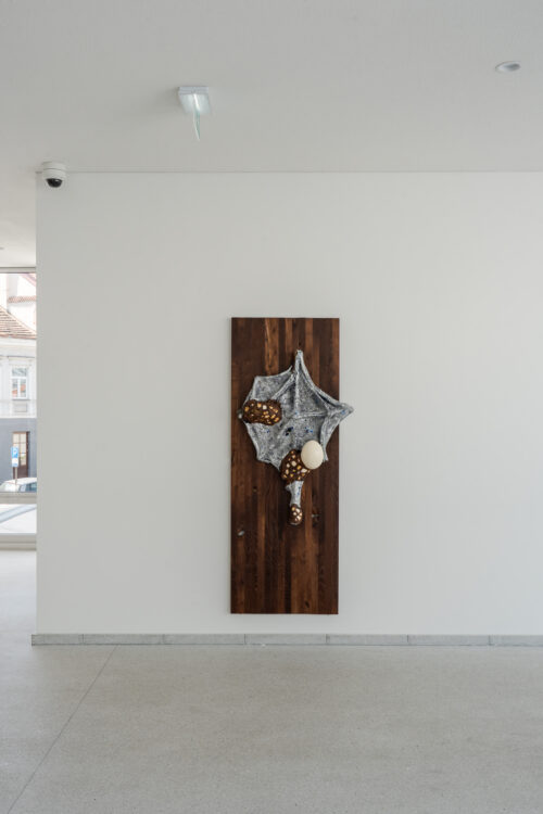 The garden occupies an ambiguous place here: both a refuge in nature (so important for the Romanticist worldview) and an enclosure – a meeting place of the quasi-natural and the artificial. This duality is reflected in the works inhabiting the exhibition space. At the same time, the investigation expands to the body as a primal structure in relation to architecture. Its different layers can be inverted, yet they bring their own logic. Architecture, typically seen as artificial, is here considered an alive, mutating organism. Objects are placed in unexpected locations – on window frames, doors, staircases – transforming the space into an invasive yet cultivated garden woven into the fabric of the building. Umbrella-shaped sculptural elements evoke both a refuge, which is architectural – a roof – and a bat-like living form.