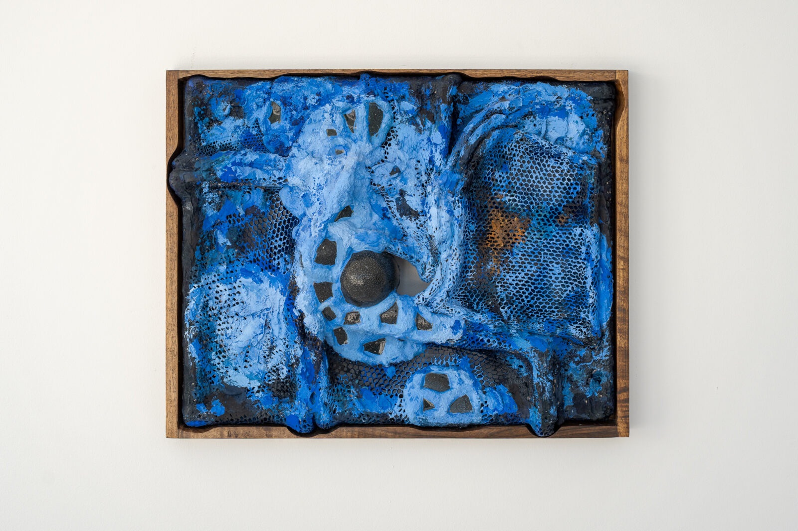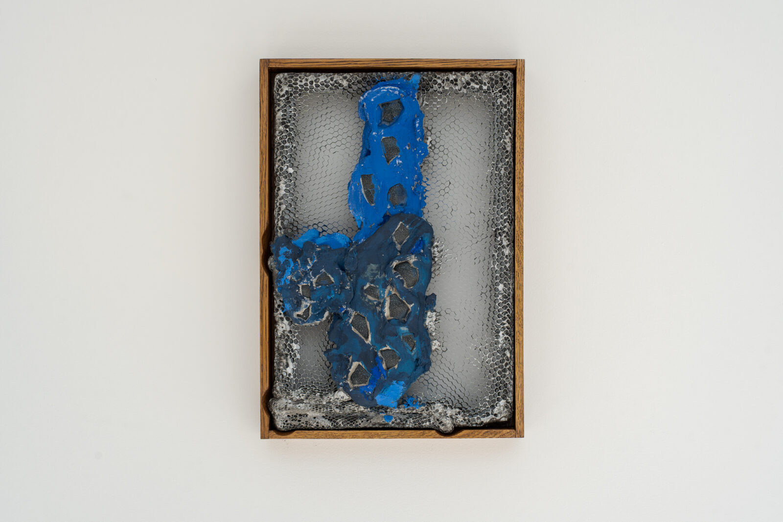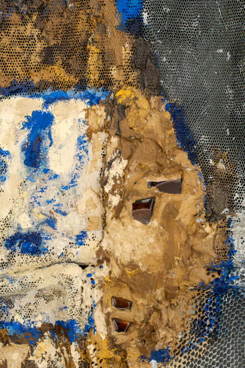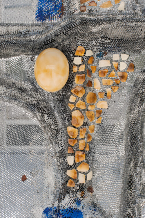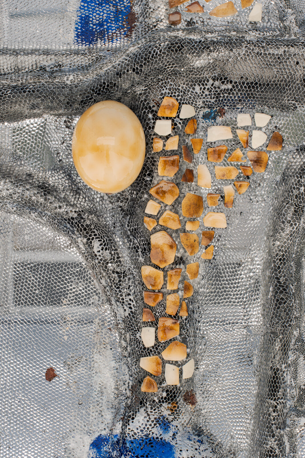 Material choice connects deeply to bodily cycles – reciprocal processes akin to compost, involving constant defragmentation and decay, and regeneration. Broken eggshells are reused, becoming mosaics. The honeycomb and the eggs, though fragile, serve as sturdy building materials. This subtle physicality encourages the viewer to encounter the objects from different angles, shifting perceptions of the exhibition space and emphasising intimacy with the work.