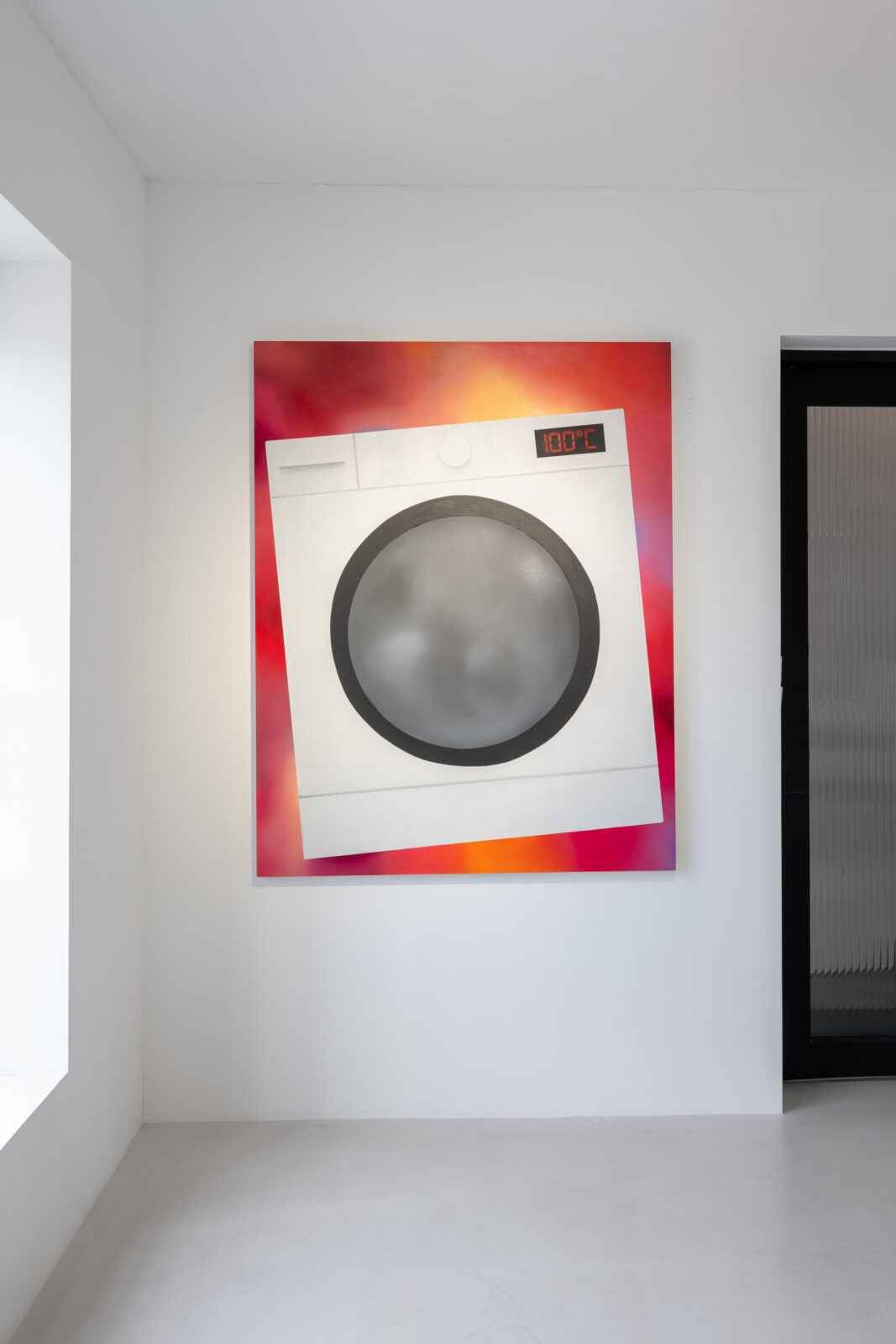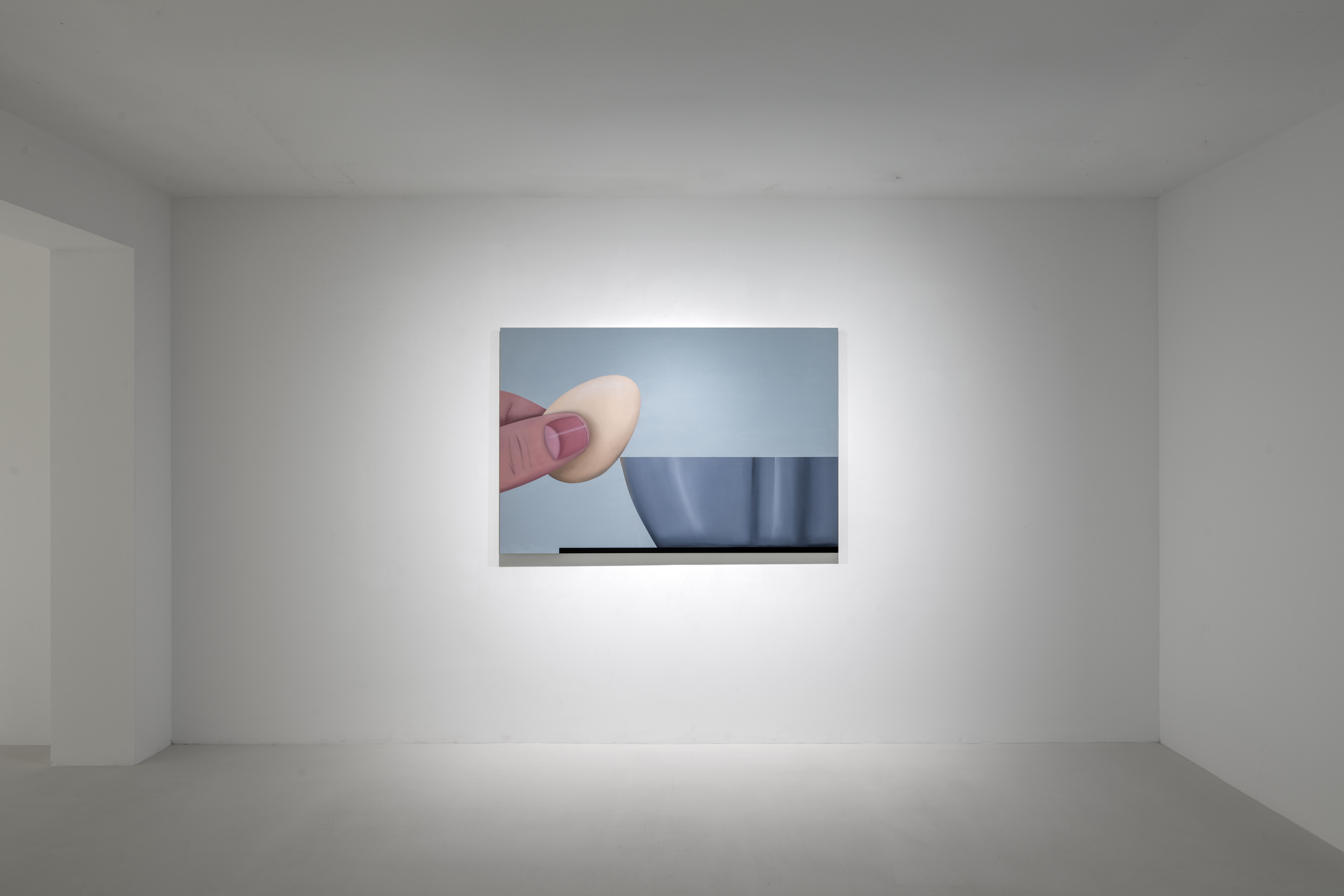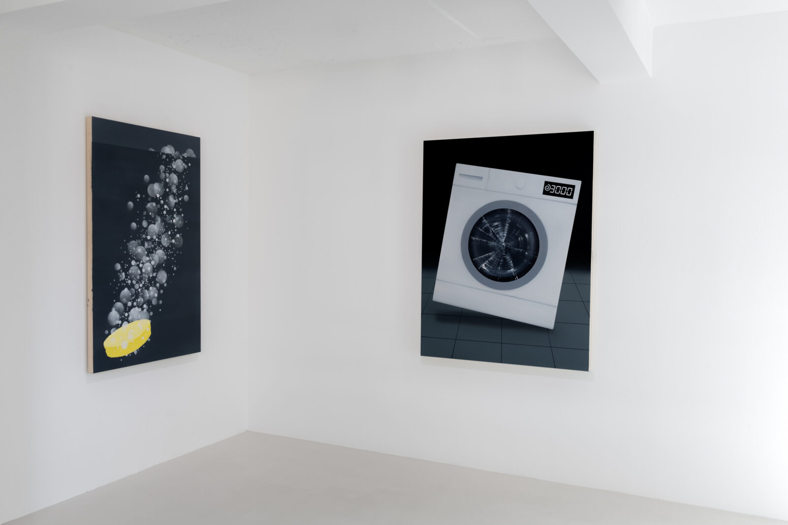 When we look at Kręcicki’s paintings we first see a depiction of a familiar object or activity. Little by little we begin to realize the works let us hear the noise characteristic of the depicted action. All the paintings in the exhibition have this multisensory quality and their relationship to sound tells the story of Gentle Spin. Bubbles and Good morning, for example, evoke the characteristic sounds of the depicted actions typically found in the morning: the fizz of a dissolving tablet and the chink of an egg cracking against metal. Two paintings of oversized washing machines, 3000 and 100°, depict the appliances dancing above the floor as if in mid-motion, and make the rattling of a washing machine palpable, even letting us feel their vibrations. The works depicting a slippered foot in the dark or the paintings of earplugs are equally related to sound: they allude to a longing for quiet, the desire to keep out unwanted noises. As such, the still lives of earplugs combine personal experiences—the artist has had bouts of insomnia—with Kręcicki’s interest in art history, in particular the work of Paul Cézanne and Giorgio Morandi.