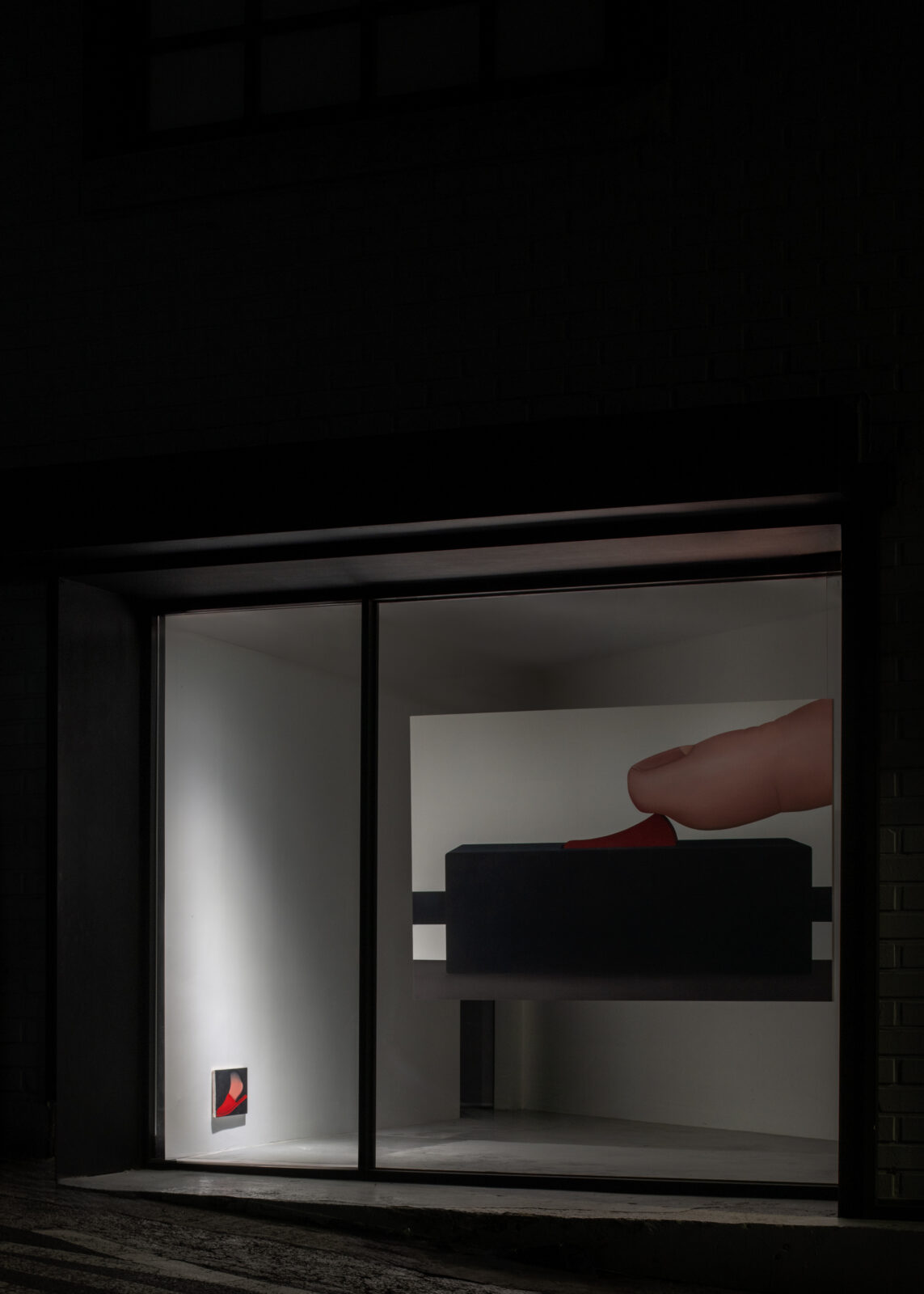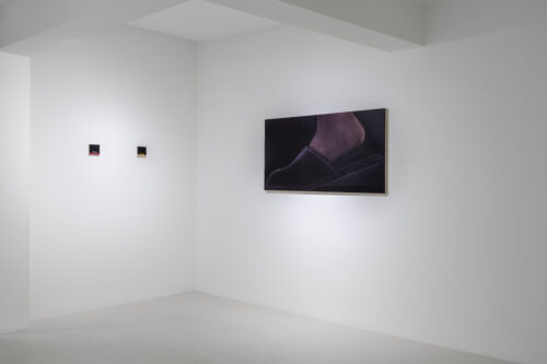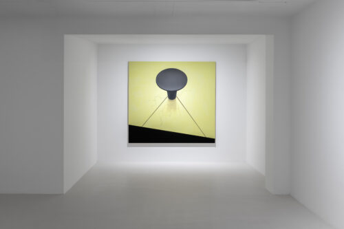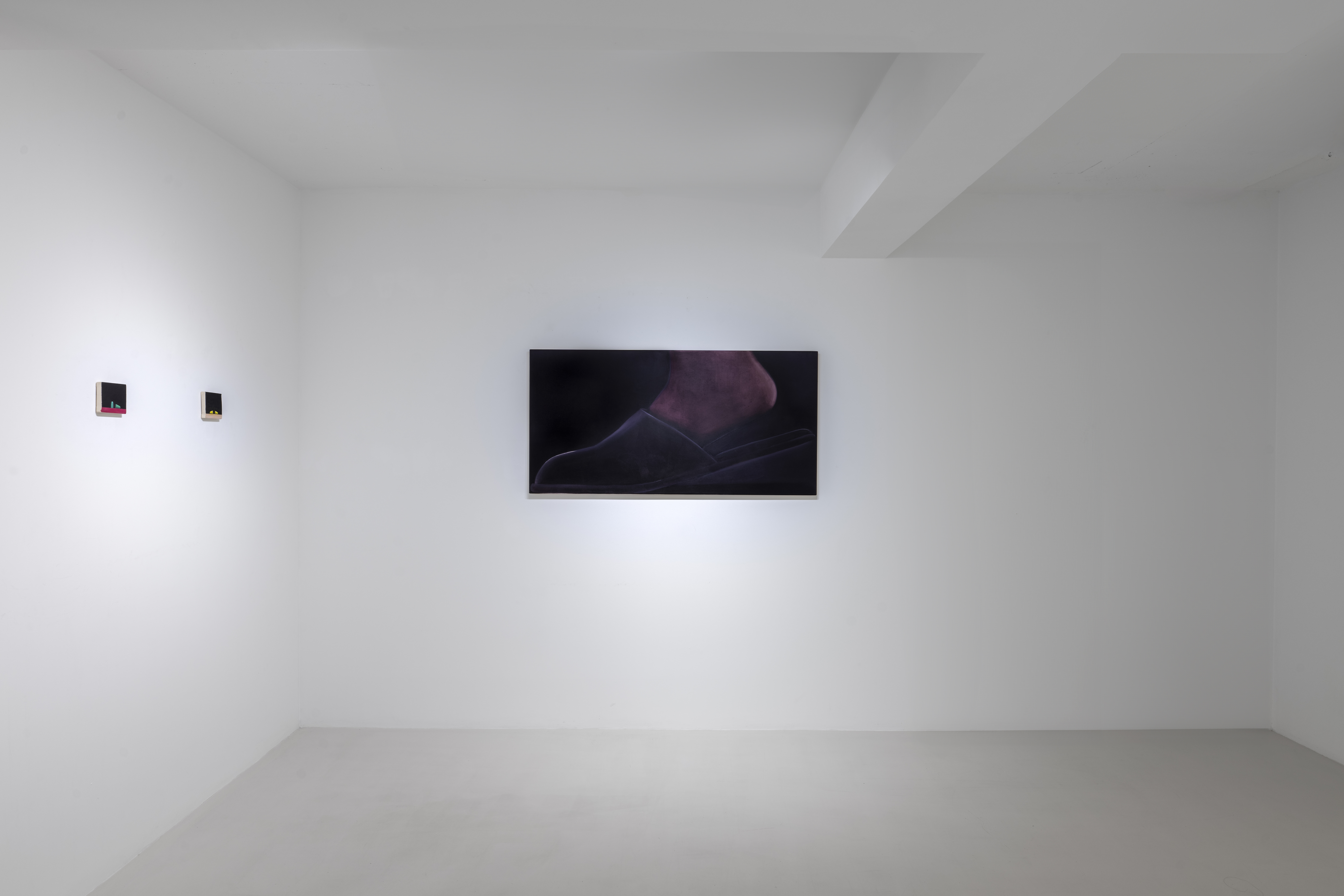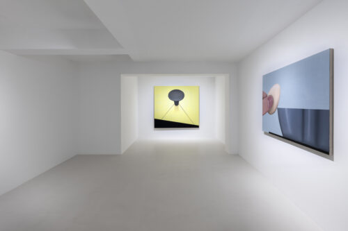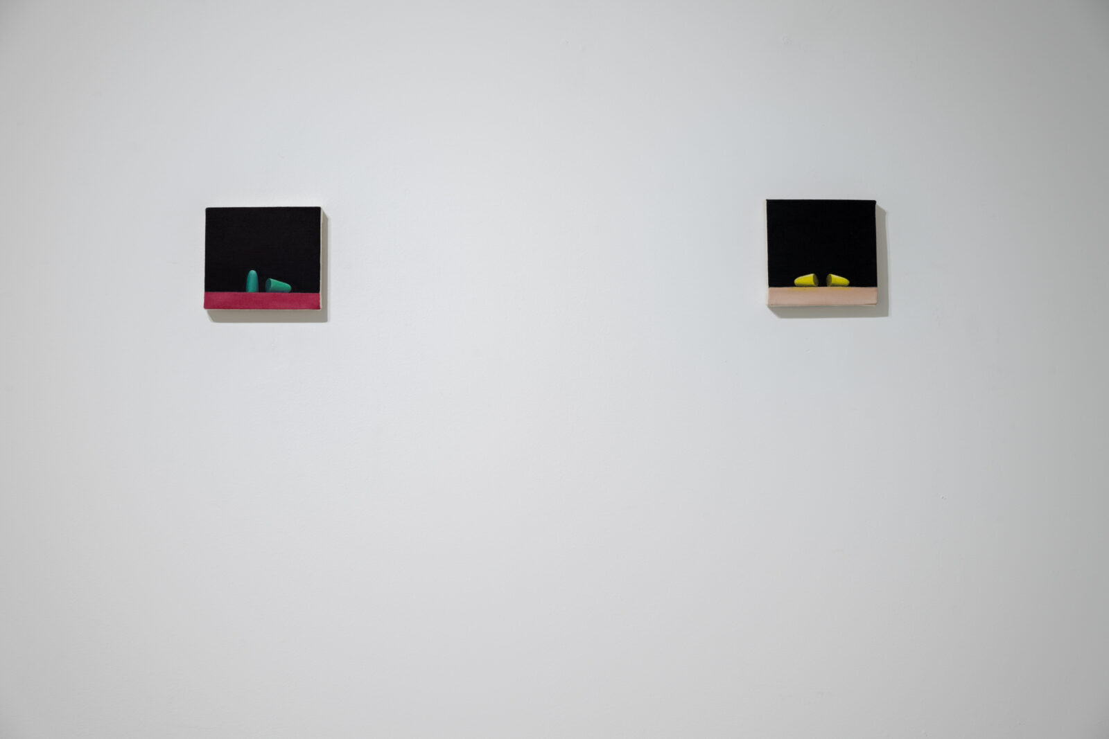 When we look at Kręcicki’s paintings we first see a depiction of a familiar object or activity. Little by little we begin to realize the works let us hear the noise characteristic of the depicted action. All the paintings in the exhibition have this multisensory quality and their relationship to sound tells the story of Gentle Spin. Bubbles and Good morning, for example, evoke the characteristic sounds of the depicted actions typically found in the morning: the fizz of a dissolving tablet and the chink of an egg cracking against metal. Two paintings of oversized washing machines, 3000 and 100°, depict the appliances dancing above the floor as if in mid-motion, and make the rattling of a washing machine palpable, even letting us feel their vibrations. The works depicting a slippered foot in the dark or the paintings of earplugs are equally related to sound: they allude to a longing for quiet, the desire to keep out unwanted noises. As such, the still lives of earplugs combine personal experiences—the artist has had bouts of insomnia—with Kręcicki’s interest in art history, in particular the work of Paul Cézanne and Giorgio Morandi.