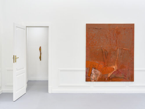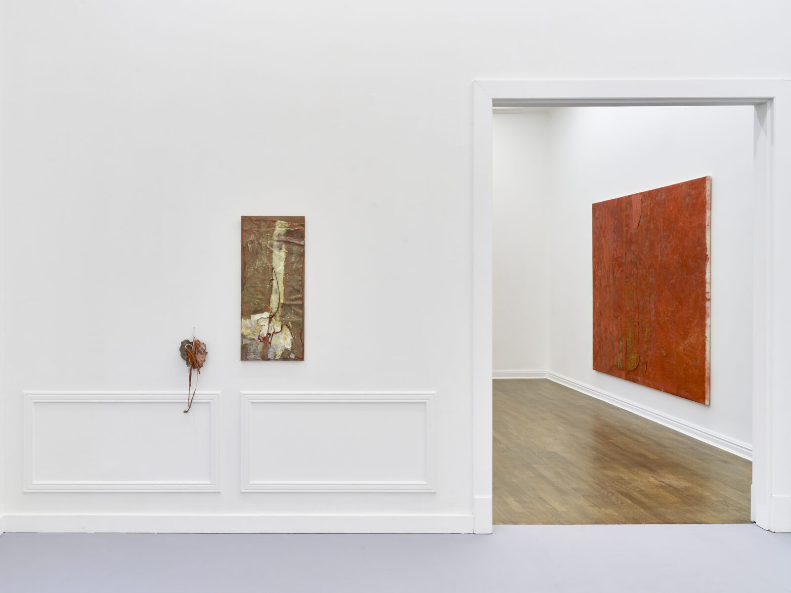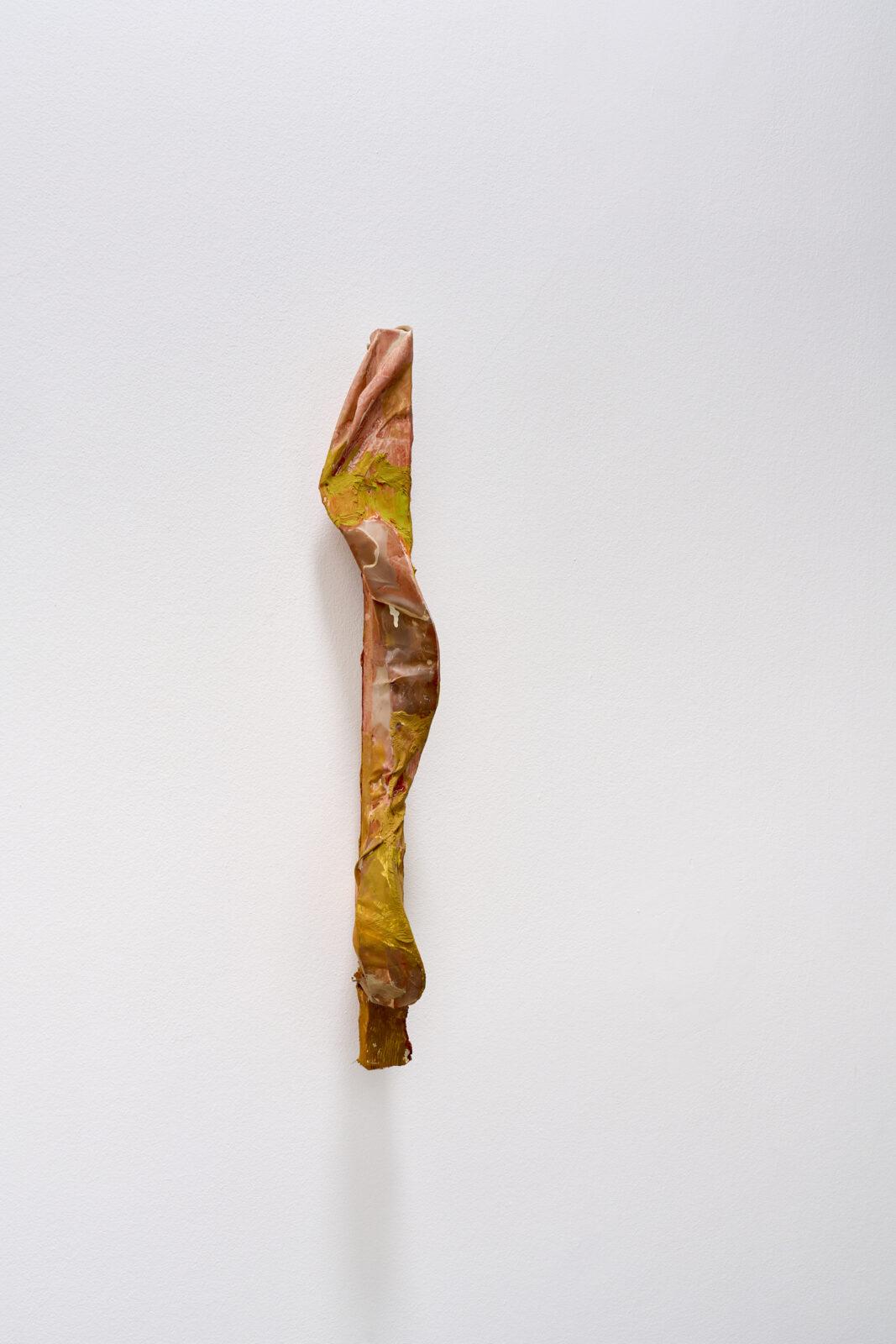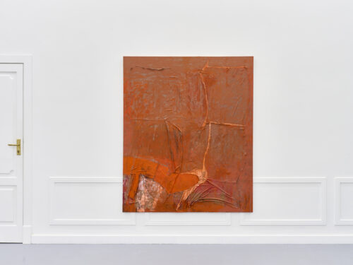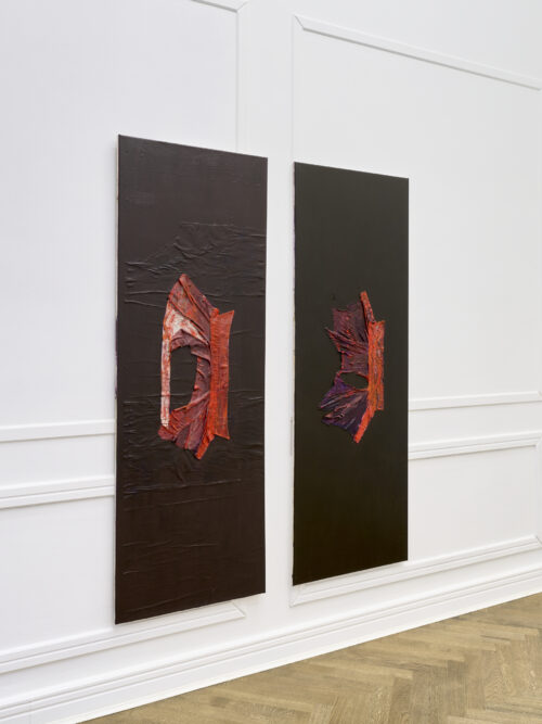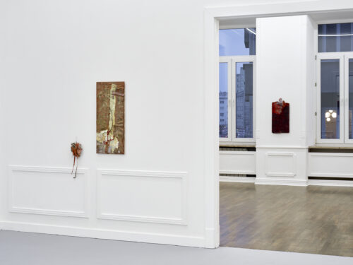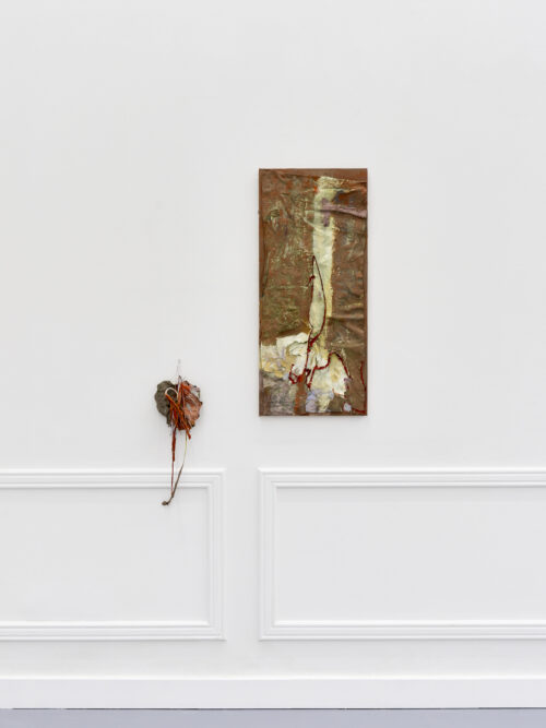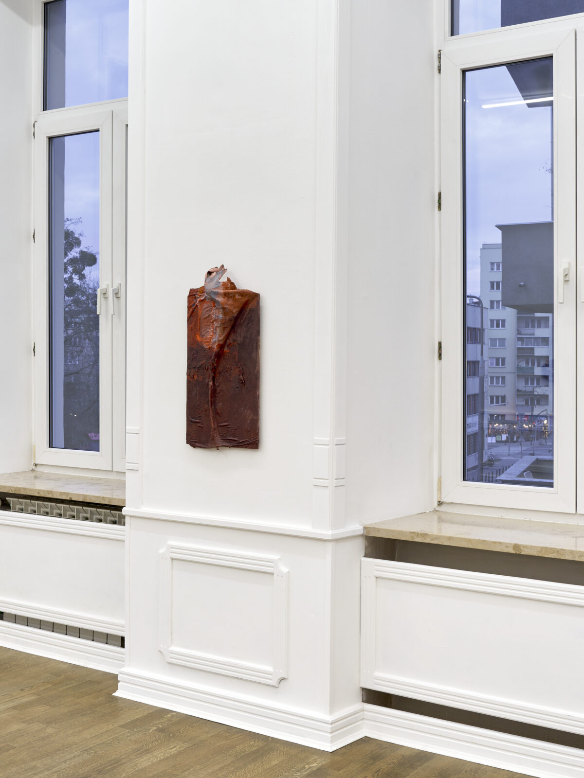 The dominant colour in the exhibition—vermilion—is charged with a certain ambivalence. It is akin to life-giving red, yet almost toxically vivid. The large-scale Untitled painting (2023-24) consists of fabric cuttings affixed to the canvas—excess material that shapes the texture of the work. The resulting image is a drawing of distortions, resembling a topographic map, an enlarged fragment of skin, or an MRI scan. Czyszczoń is drawn to the kinship between phenomena precisely where deviations and protrusions emerge. A fitting example is a smaller work on board (Untitled, 2023-24), where an earthy red-brown canvas wraps around a plant stem like a bandage on a broken bone.