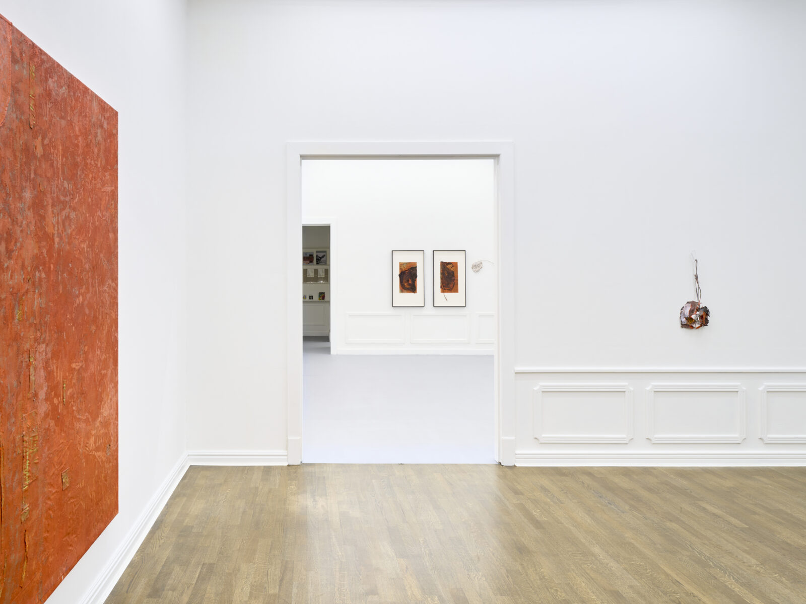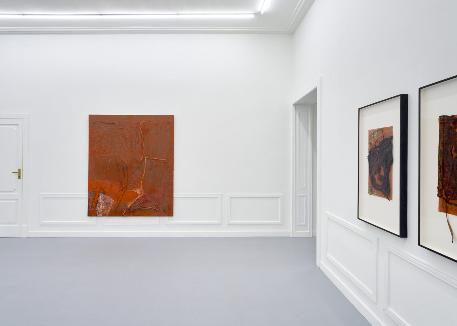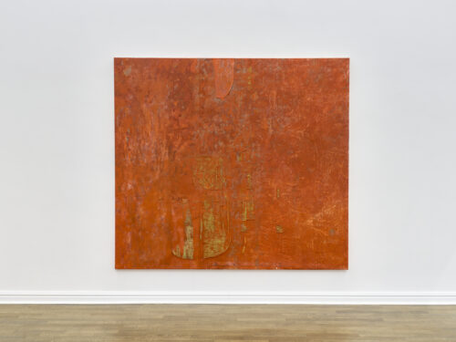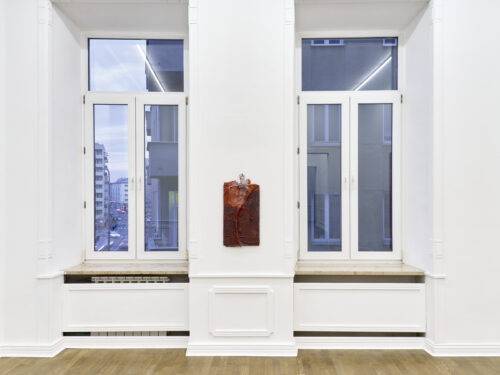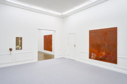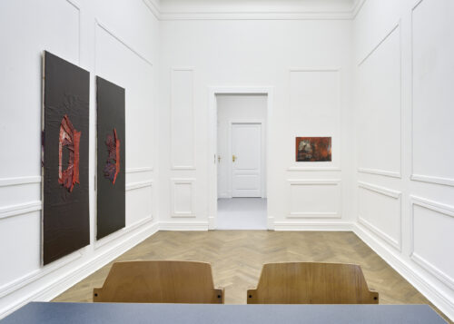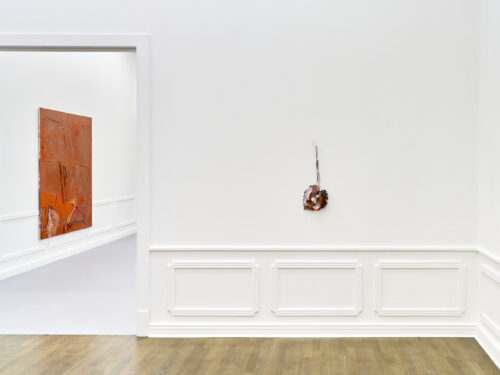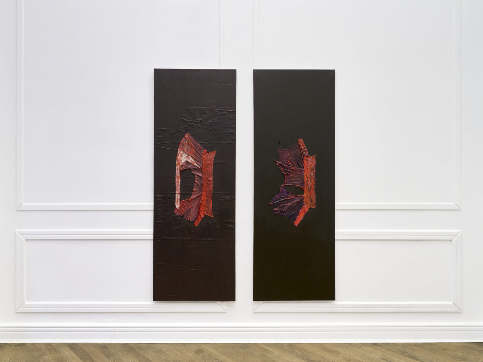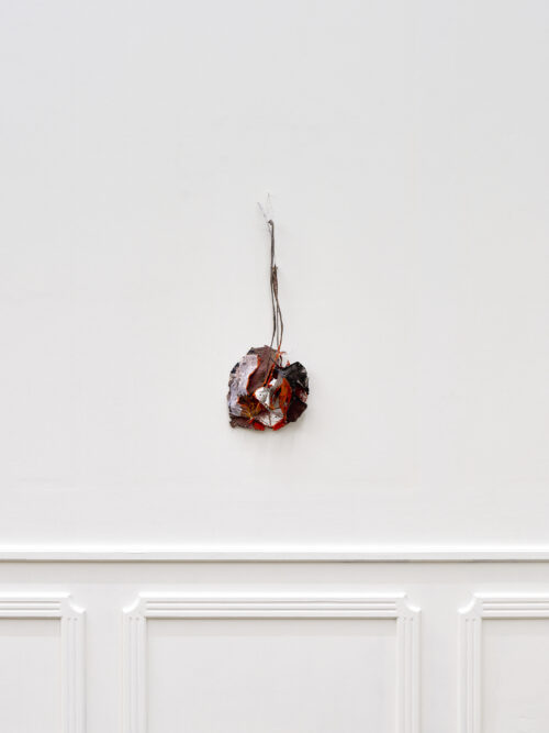 The dominant colour in the exhibition—vermilion—is charged with a certain ambivalence. It is akin to life-giving red, yet almost toxically vivid. The large-scale Untitled painting (2023-24) consists of fabric cuttings affixed to the canvas—excess material that shapes the texture of the work. The resulting image is a drawing of distortions, resembling a topographic map, an enlarged fragment of skin, or an MRI scan. Czyszczoń is drawn to the kinship between phenomena precisely where deviations and protrusions emerge. A fitting example is a smaller work on board (Untitled, 2023-24), where an earthy red-brown canvas wraps around a plant stem like a bandage on a broken bone.