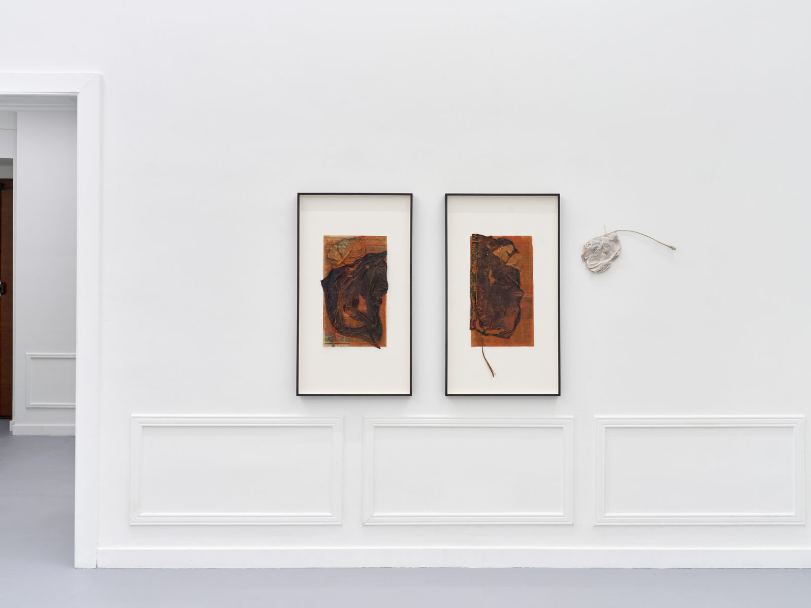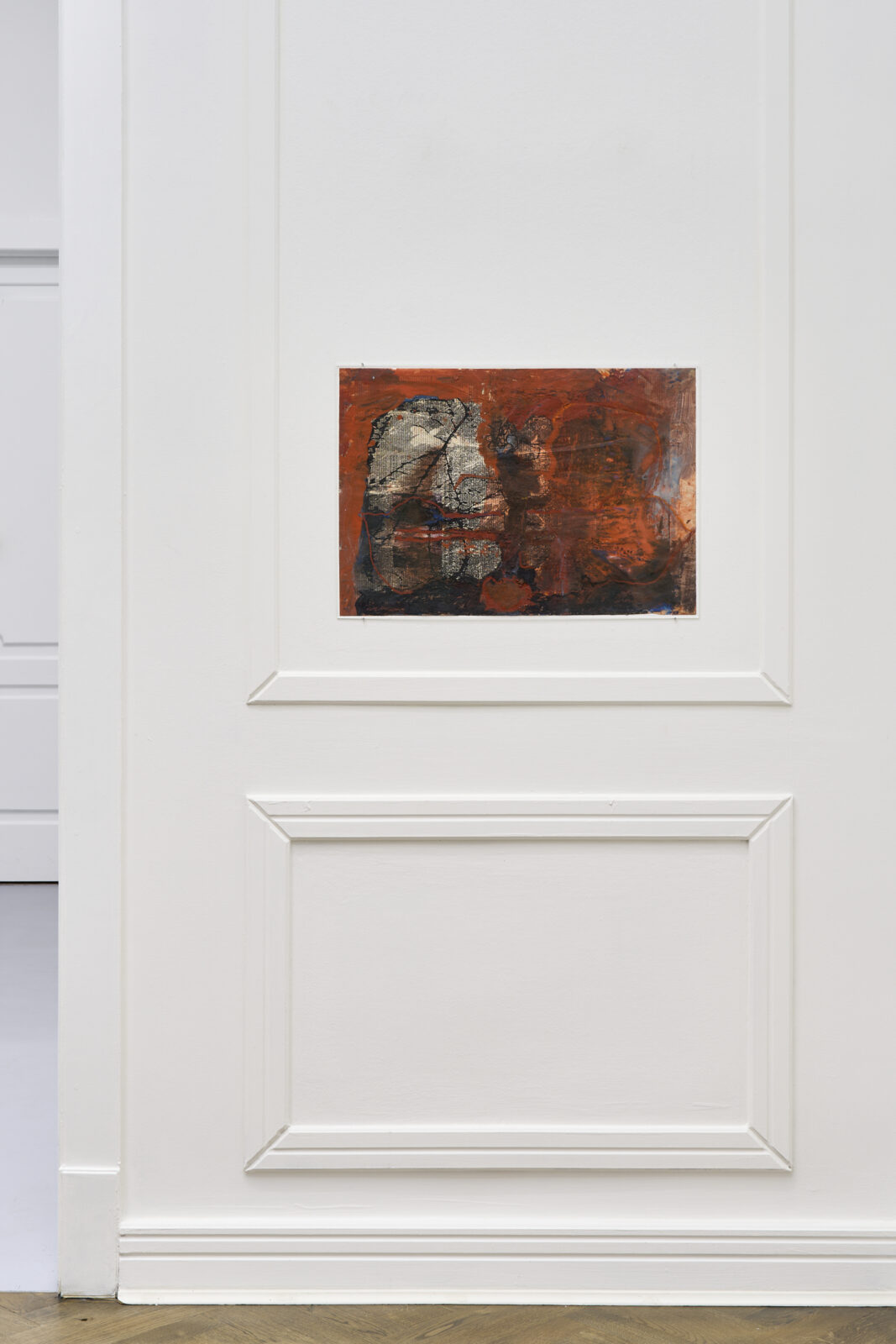 The latest works of Jakub Czyszczoń are infused with a spirit of a peculiar ecology—newspaper sheets, dry leaves, and fragments of clothing are fused together by the artist using oil paint, forming distinctive compositions. Two untitled pieces in the current exhibition, encased in wall-mounted display cases, evoke the image of radioactive puddles or artefacts from a museum yet to be built. The choice of materials is both unexpected and deliberate, revealing, upon closer inspection, the artist’s fundamental method. Its essence lies in a game of concealment and revelation. Czyszczoń is not driven by an analytical intent, but rather by an intuitive approach—observing details from a distance and within the broader context.