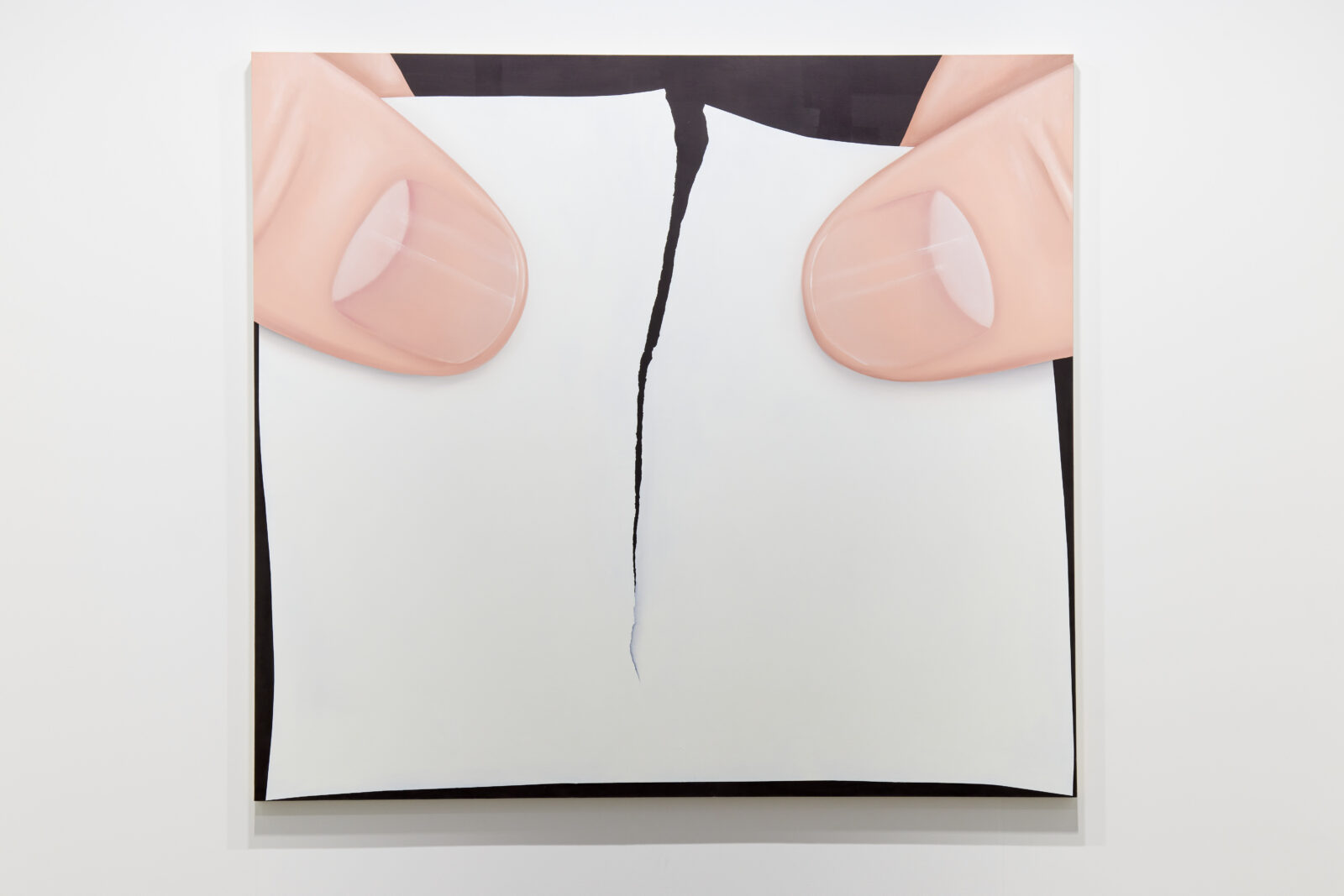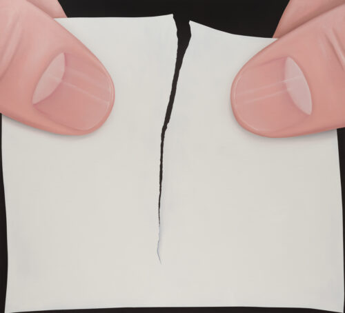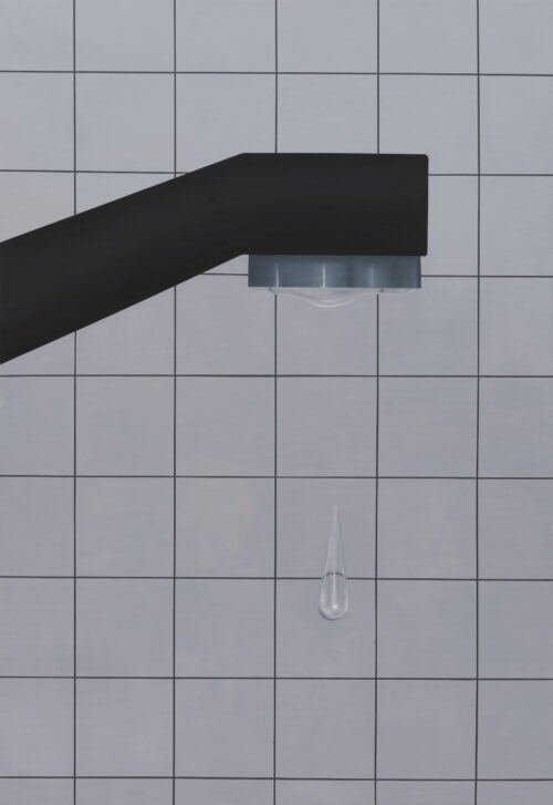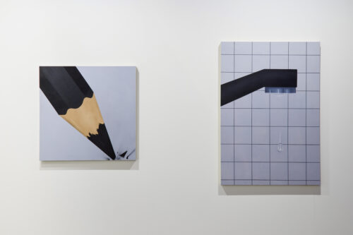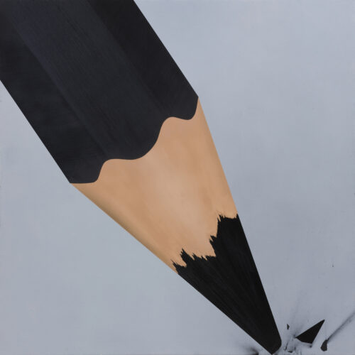 At the visual level, the paintings consist of realistic elements – ordinary objects (paper sheet, pencil, water tap, etc), fragments of the human body (fingers) – while their actual content is a concrete sound that the viewer must recreate in mind in order to understand the meaning of the work. It is as if the artist and the viewer would conduct a conversation but instead of words, images and sounds were traded. In this sense, Kręcicki’s works clearly go beyond visuality and involve the viewer in the process of shaping their sense. Always taken from everyday life, the depictions do not so much visualize as they evoke specific sounds: tearing apart, dripping, crackling, clicking etc. In this way, the (hyper-)realism practiced by the artist is reinforced by the intangible aspect.