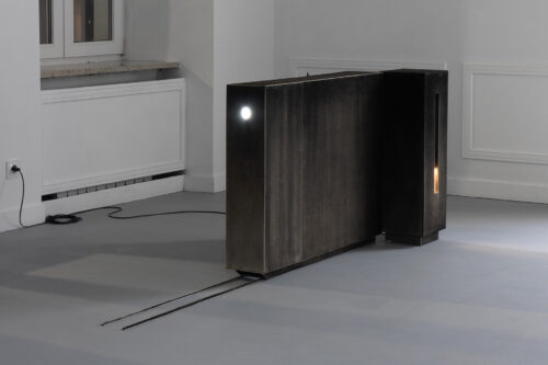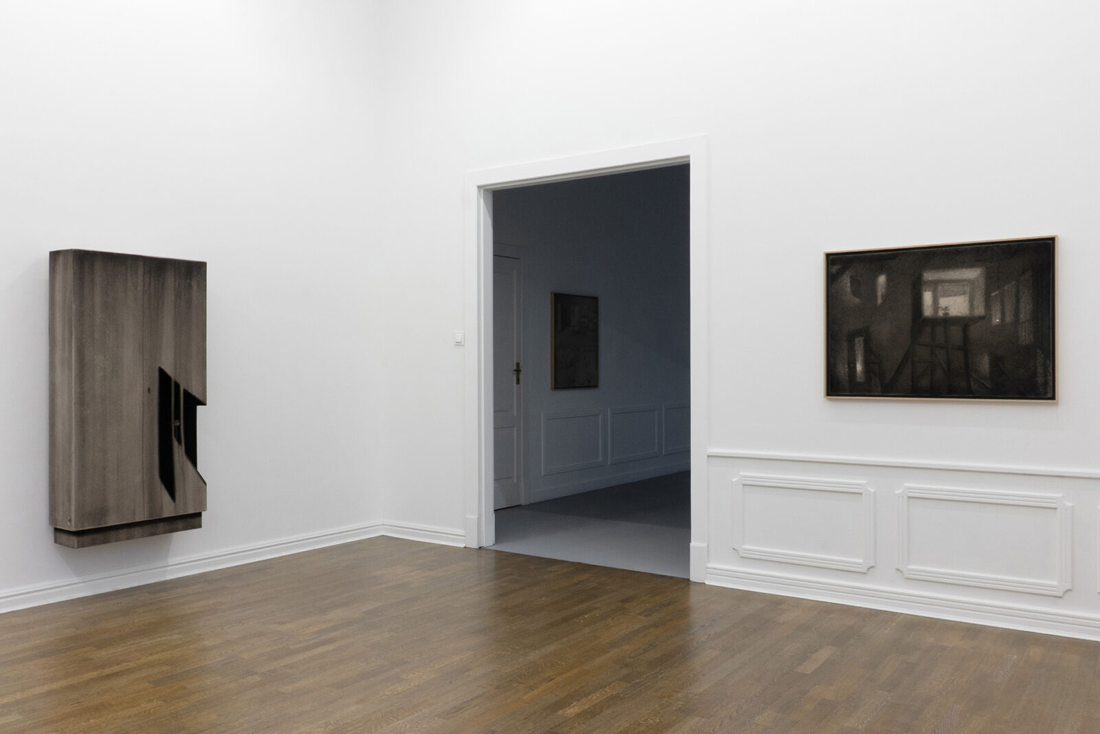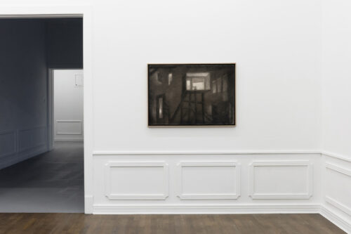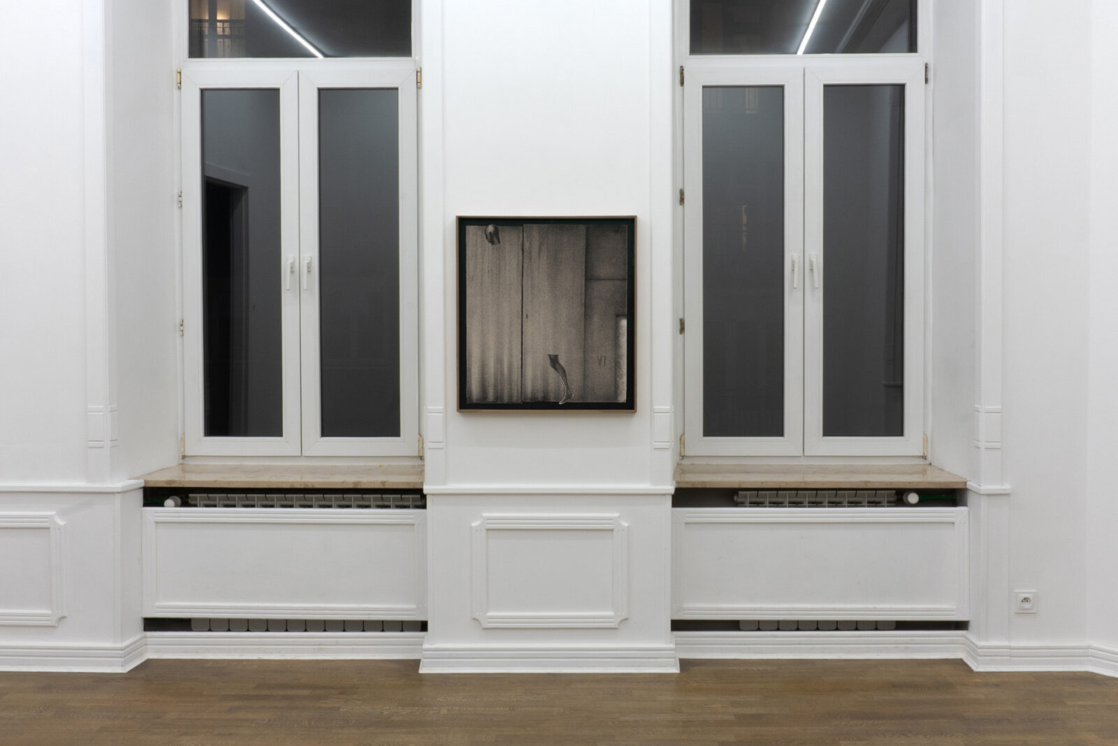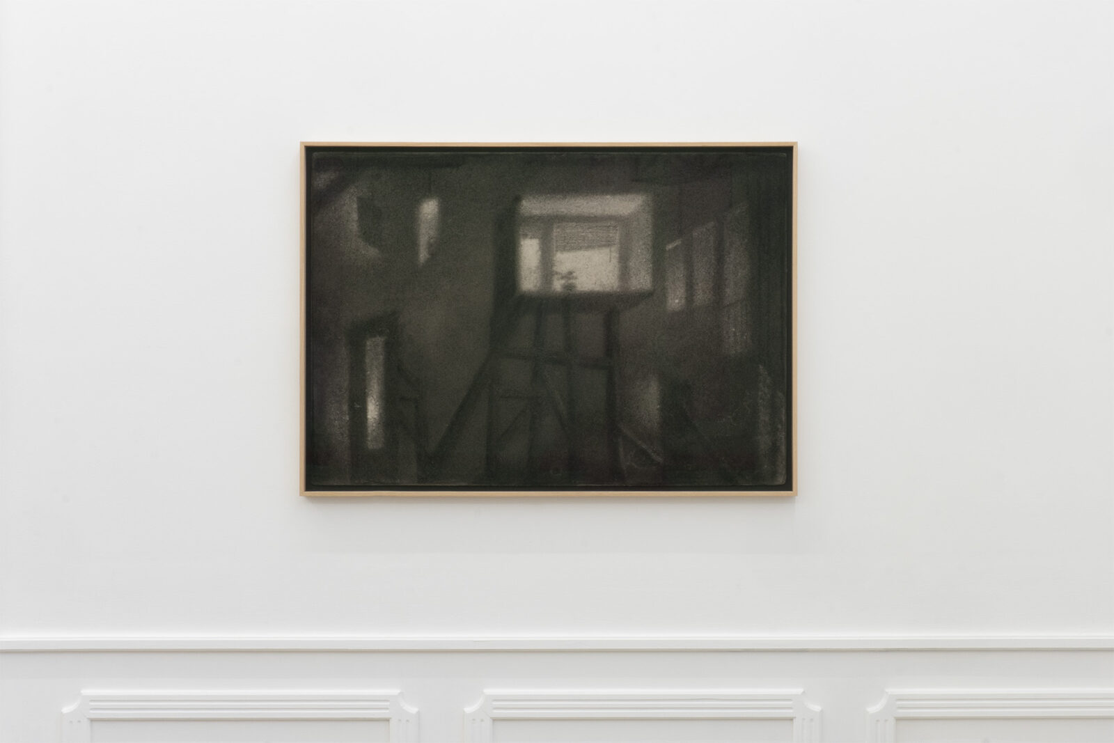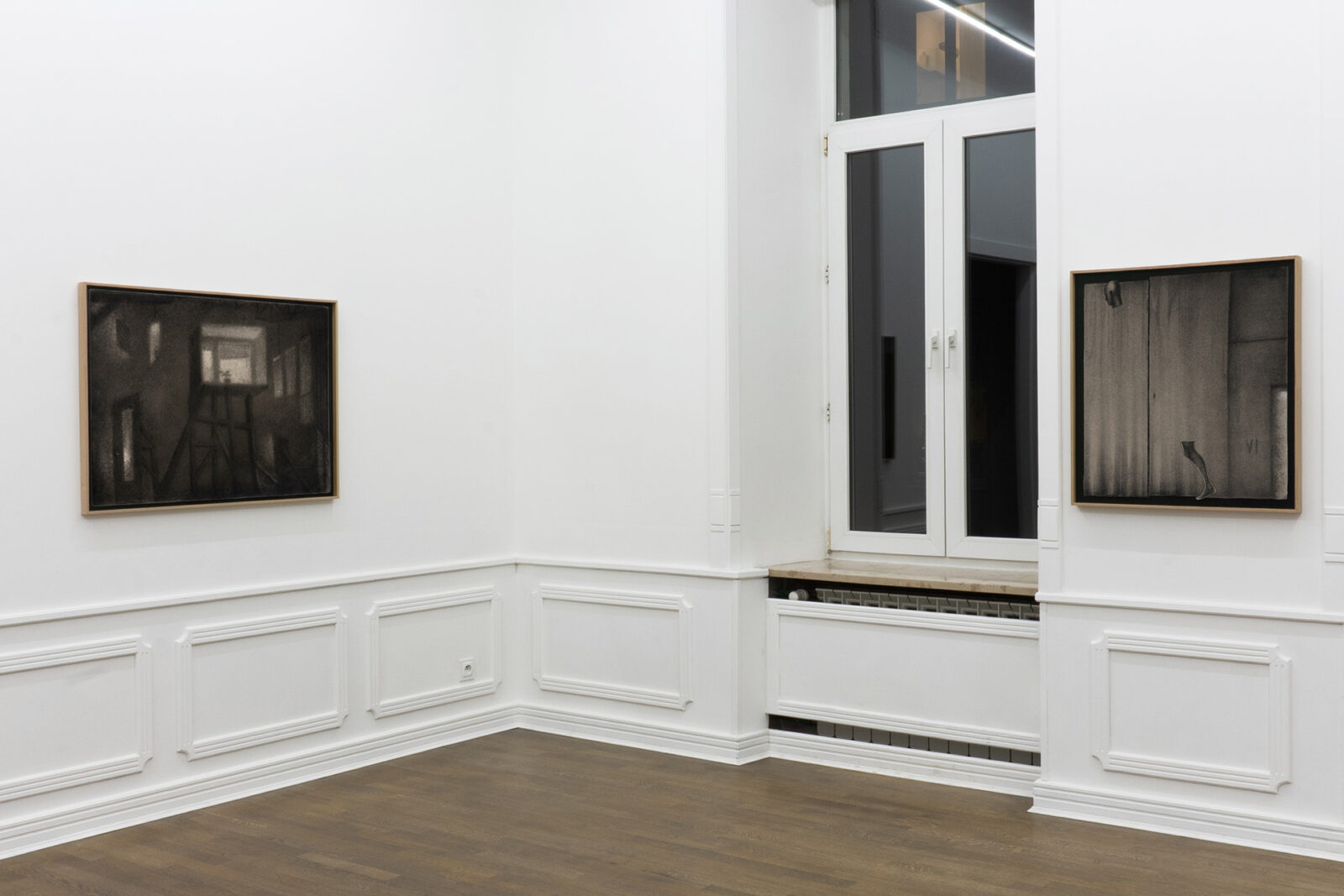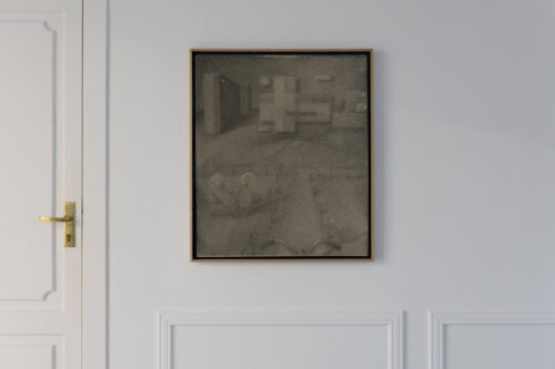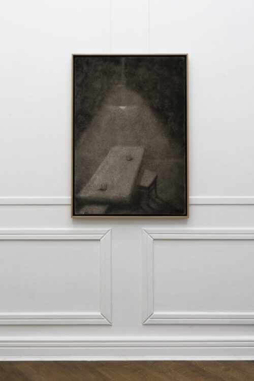For the past several years, Bąkowski has been developing his own technique of drawing with charcoal on sanded cardboard. The resulting grainy depictions evoke underexposed views of cityscapes and household appliances in semi-darkness, as well as low-resolution video recordings. The artist himself traces the origins of his own aesthetic to the 1980s, particularly to the quality of VHS recordings from that period. Bąkowski’s work is almost entirely retrospective: he is interested in memory and perception, and is fascinated by the provisional and accidental nature of their construction. Hence the simple means, basic materials and home-made quality.