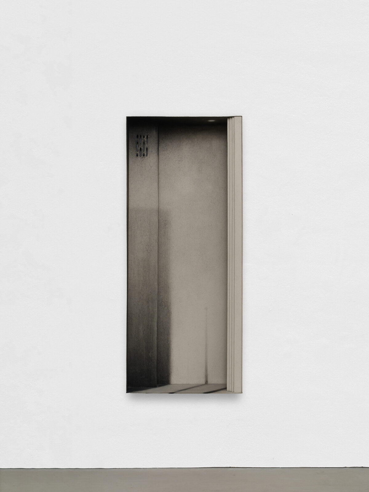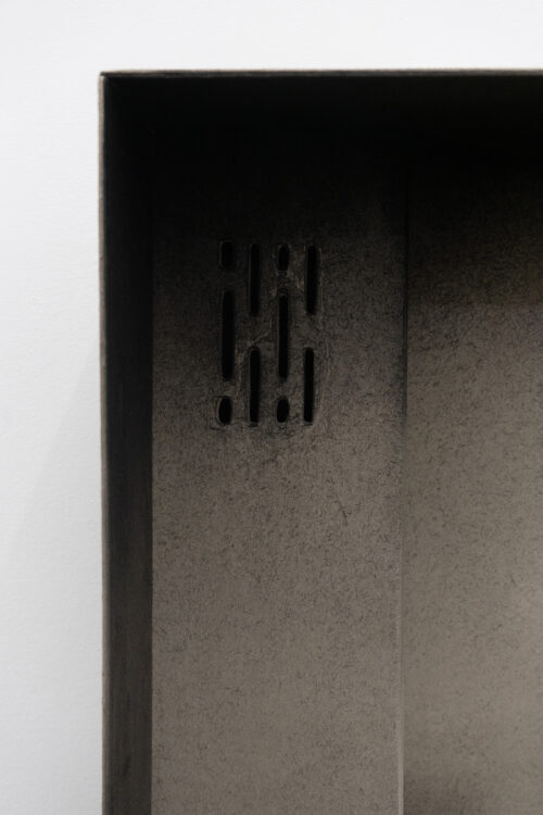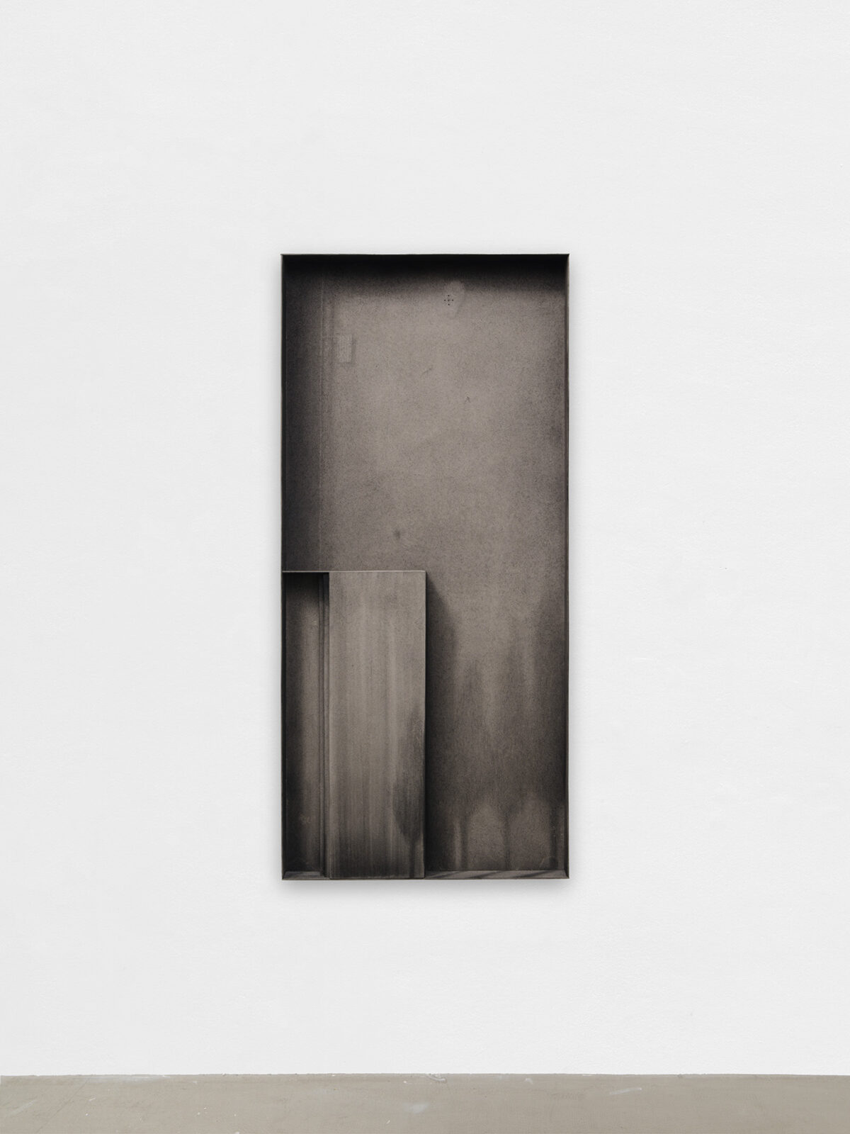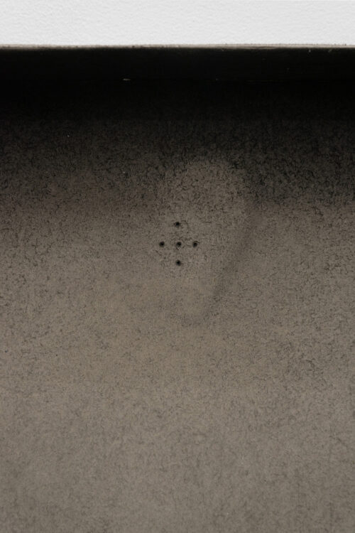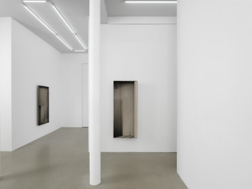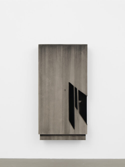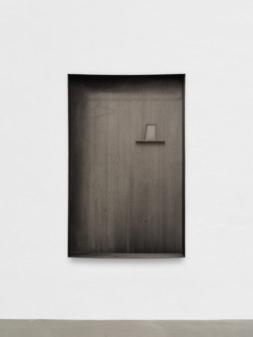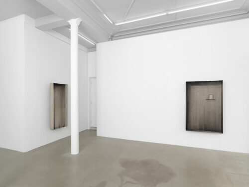 The exhibition features four new works, wardrobe-landscapes, which aim to evoke the mental state the artist experiences when he finds himself in an empty apartment or a hotel room. Since childhood, Bąkowski has suffered from tinnitus, which he describes as noises in his head, filling his inner world. Growing up in a housing block in Poznań, surrounded by sound, the artist refers to this place as his “mental home,” a space to which he aspires to return, as it is where he feels most at home. These personal experiences are reflected in the objects on display: charcoal on cardboard works that represent a blend of external and internal landscapes. To prepare his surfaces for drawing, Bąkowski sands heavy cardboard to create a rough texture, before using charcoal or pastel to craft smoky atmospheres from which his figures and places emerge. Trees or street lamps appear on furniture elements as shadows or ghosts. For Bąkowski, atmosphere is crucial, and he views these works as metaphors for the human soul.