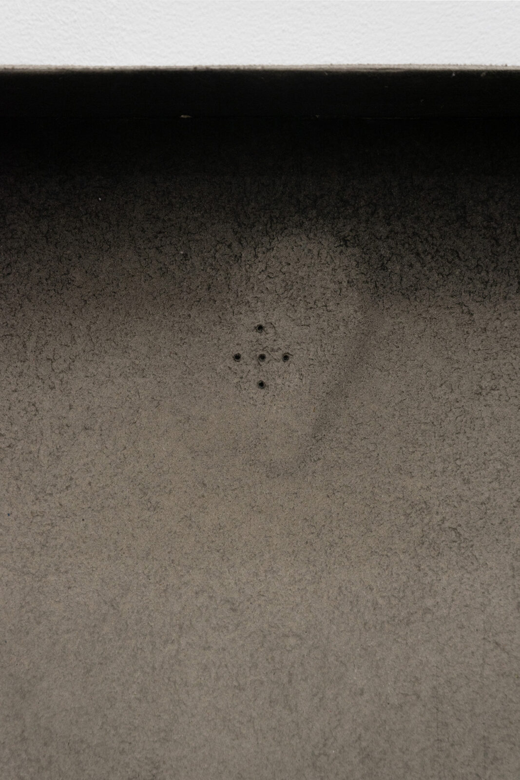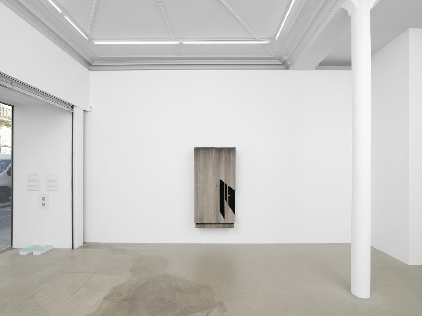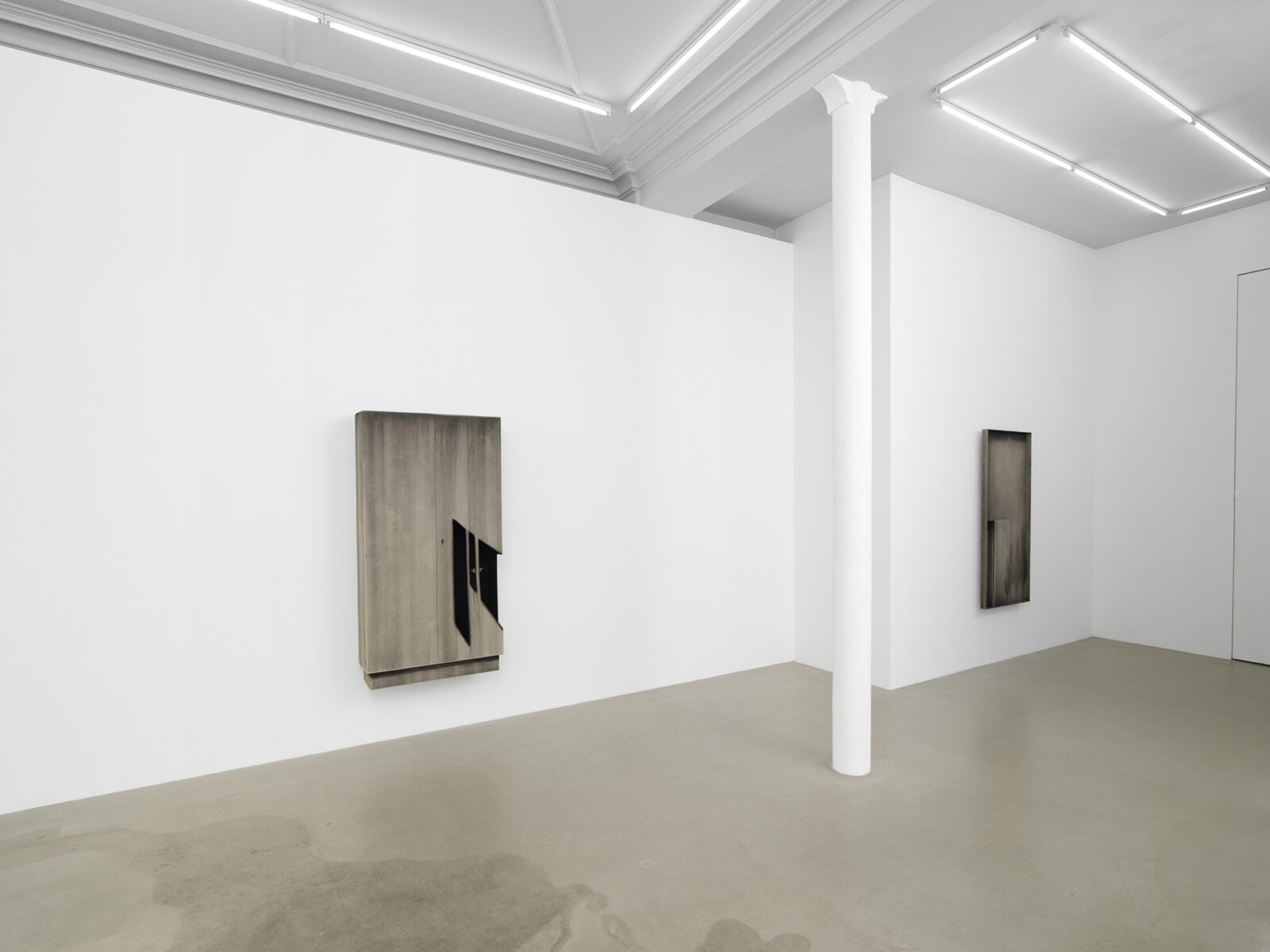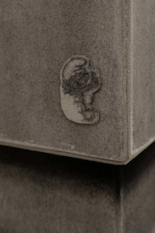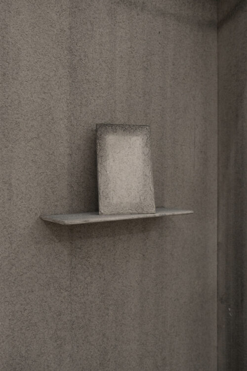 The exhibition features four new works, wardrobe-landscapes, which aim to evoke the mental state the artist experiences when he finds himself in an empty apartment or a hotel room. Since childhood, Bąkowski has suffered from tinnitus, which he describes as noises in his head, filling his inner world. Growing up in a housing block in Poznań, surrounded by sound, the artist refers to this place as his “mental home,” a space to which he aspires to return, as it is where he feels most at home. These personal experiences are reflected in the objects on display: charcoal on cardboard works that represent a blend of external and internal landscapes. To prepare his surfaces for drawing, Bąkowski sands heavy cardboard to create a rough texture, before using charcoal or pastel to craft smoky atmospheres from which his figures and places emerge. Trees or street lamps appear on furniture elements as shadows or ghosts. For Bąkowski, atmosphere is crucial, and he views these works as metaphors for the human soul.