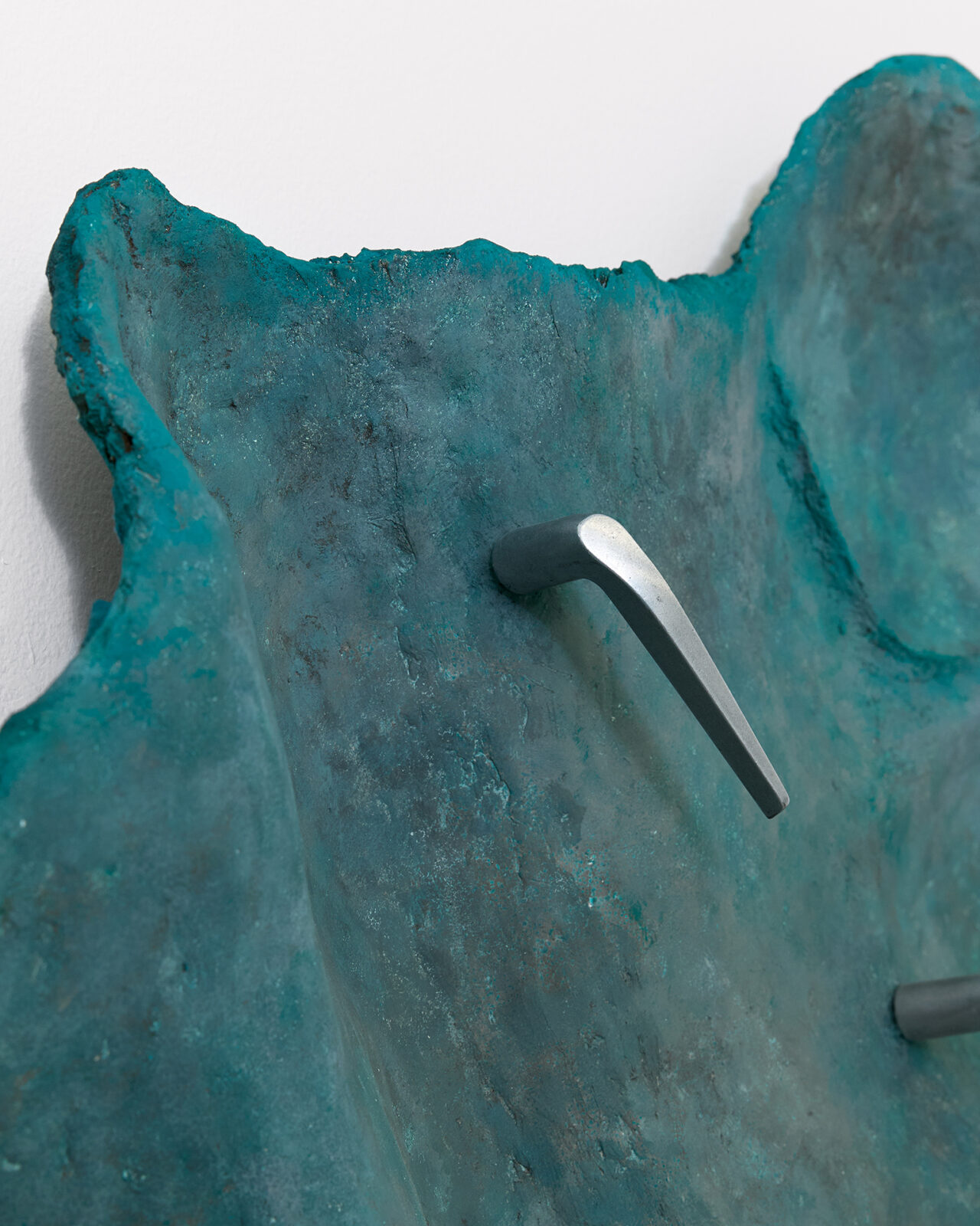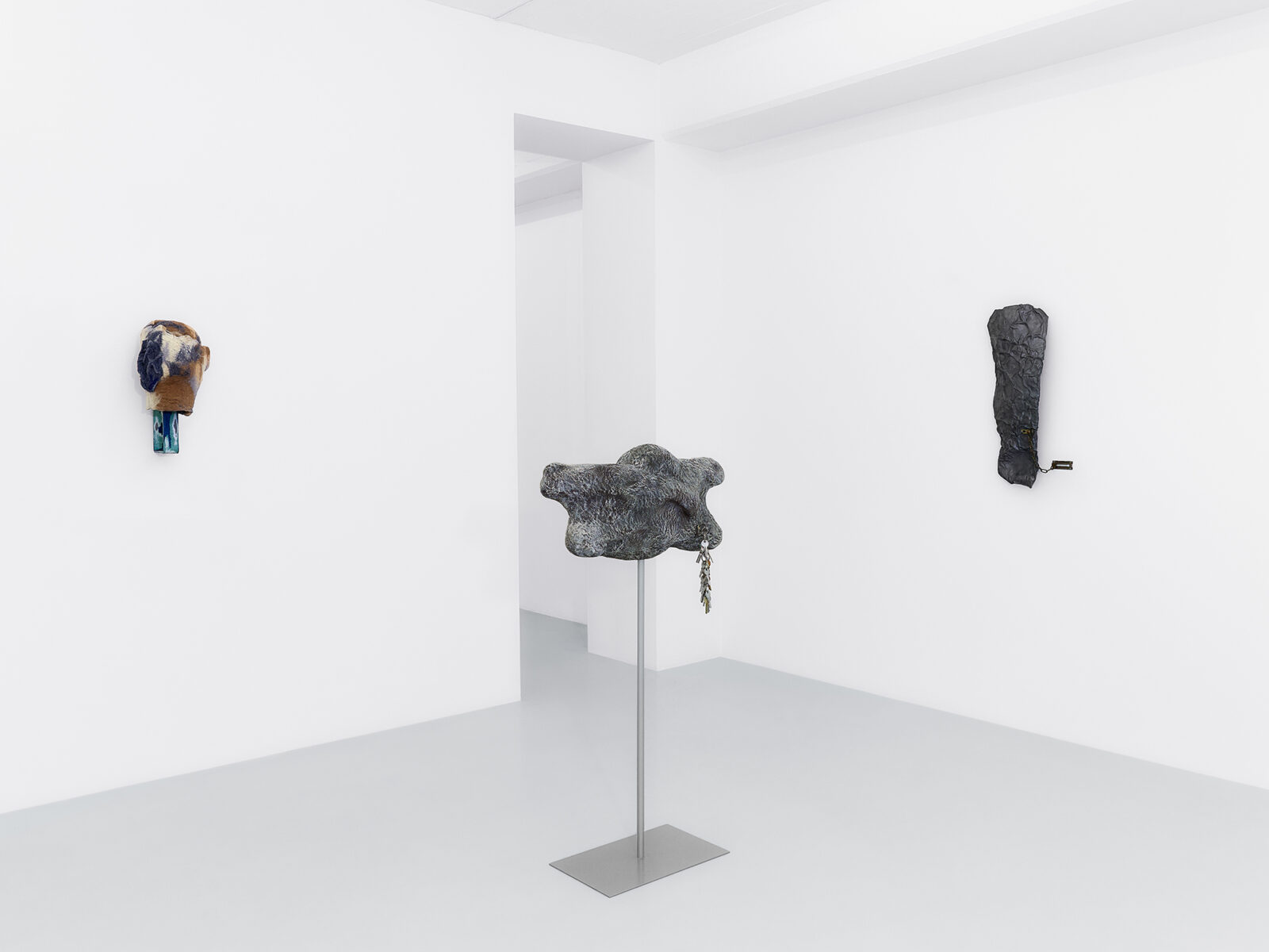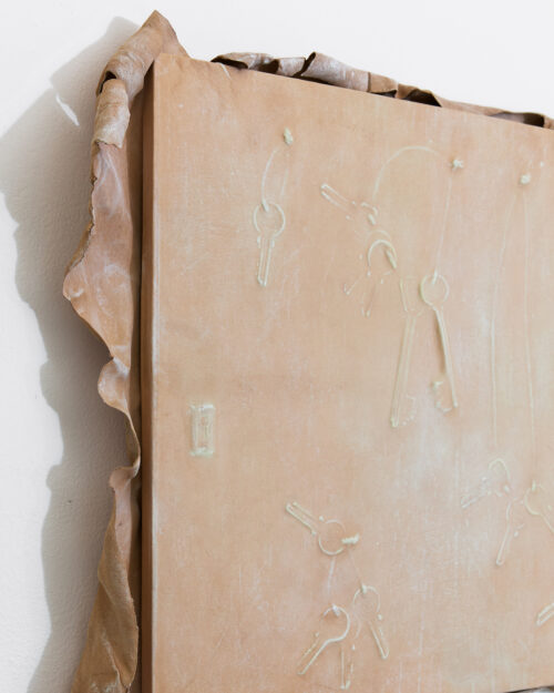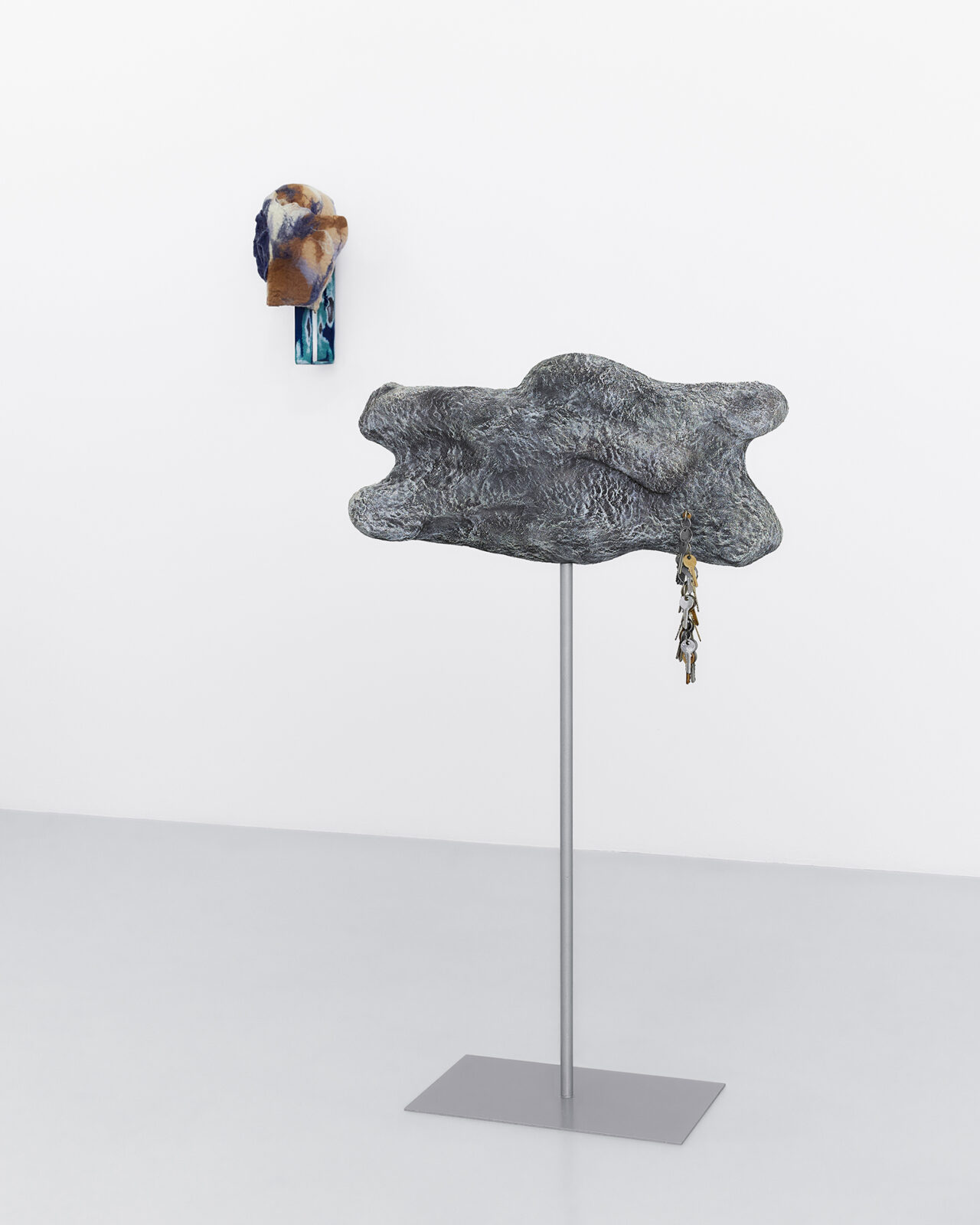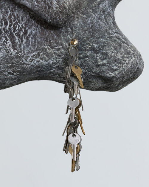 Mickiewicz’s process generates the core of the pieces: she begins with a search for mountainous, rocky locations with sculptural quality and intrigue. Staying in these locations for extended periods, Mickiewicz absorbs their characteristics, both tangible and intangible, then, at last, seeks out fragments to capture the essence long after she has departed. Then begins an extended silicone moulding process, casting the elements which become the formal pulsing hearts of the works. In releasing the mould days later, peeling away a thin layer that preserves the imprint of a place at a particular moment [1], revealing the concrete and ephemeral embossments of said loci. As Mickiewicz sculpts, she combines various moulds with representative materials; whether felt, steel, plaster, fibre-glass, or leather, the mediums are chosen intuitively in connection with the textures and shapes of the original physical landscapes. Each sculpture thus evolves into a modular, faceted being, a final abstract entity constituted from specific forms. The symbols of thresholds adorning the works––found door handles and latches, intercoms, keys, and locks––are representative of the marked boundaries between public and private, another topographical dichotomy key to Mickiewicz’s practice. Through elevating daily tools of access to ornamental foci, these symbols lead us to pause on the daily traversal between the ostensibly distinct poles.