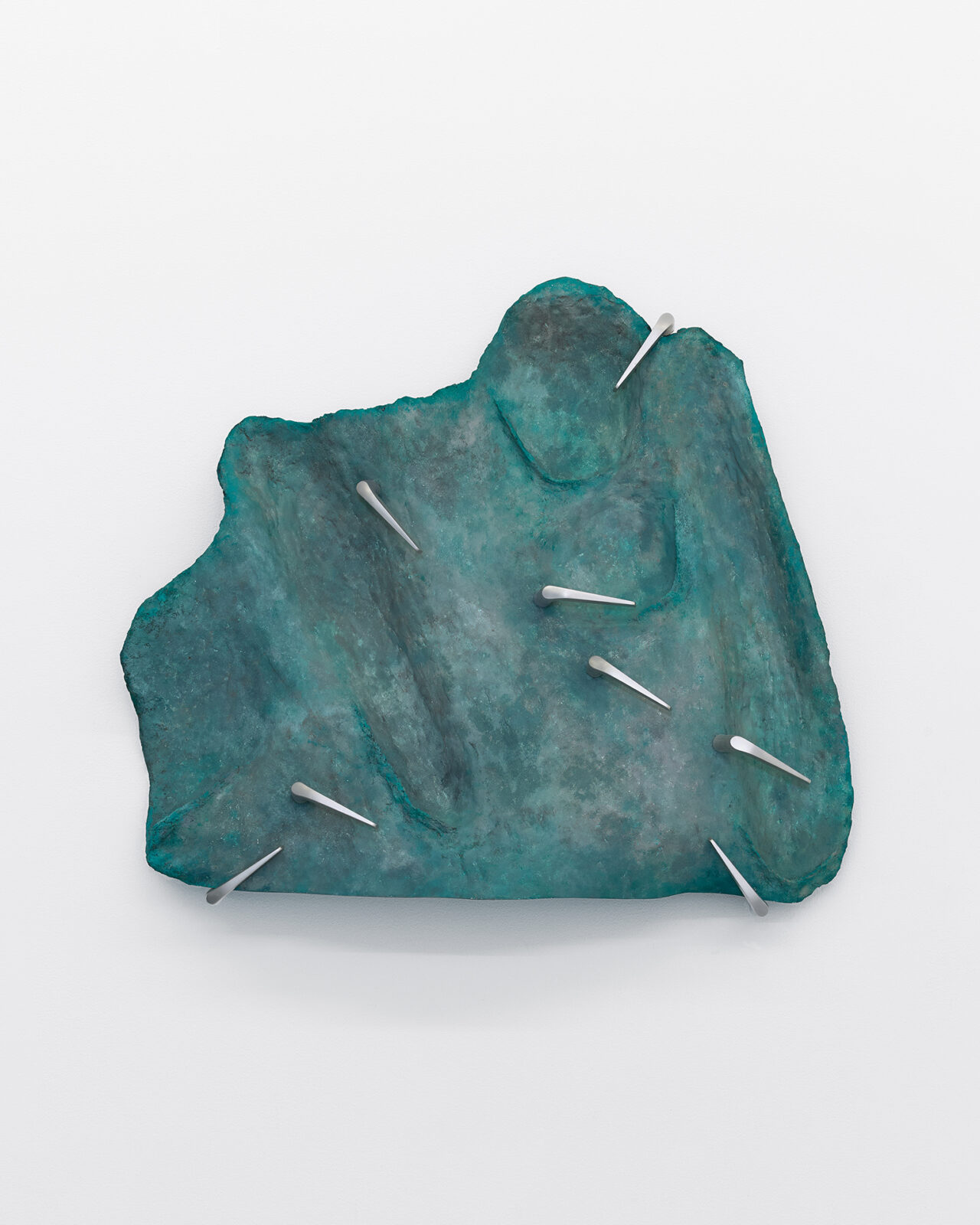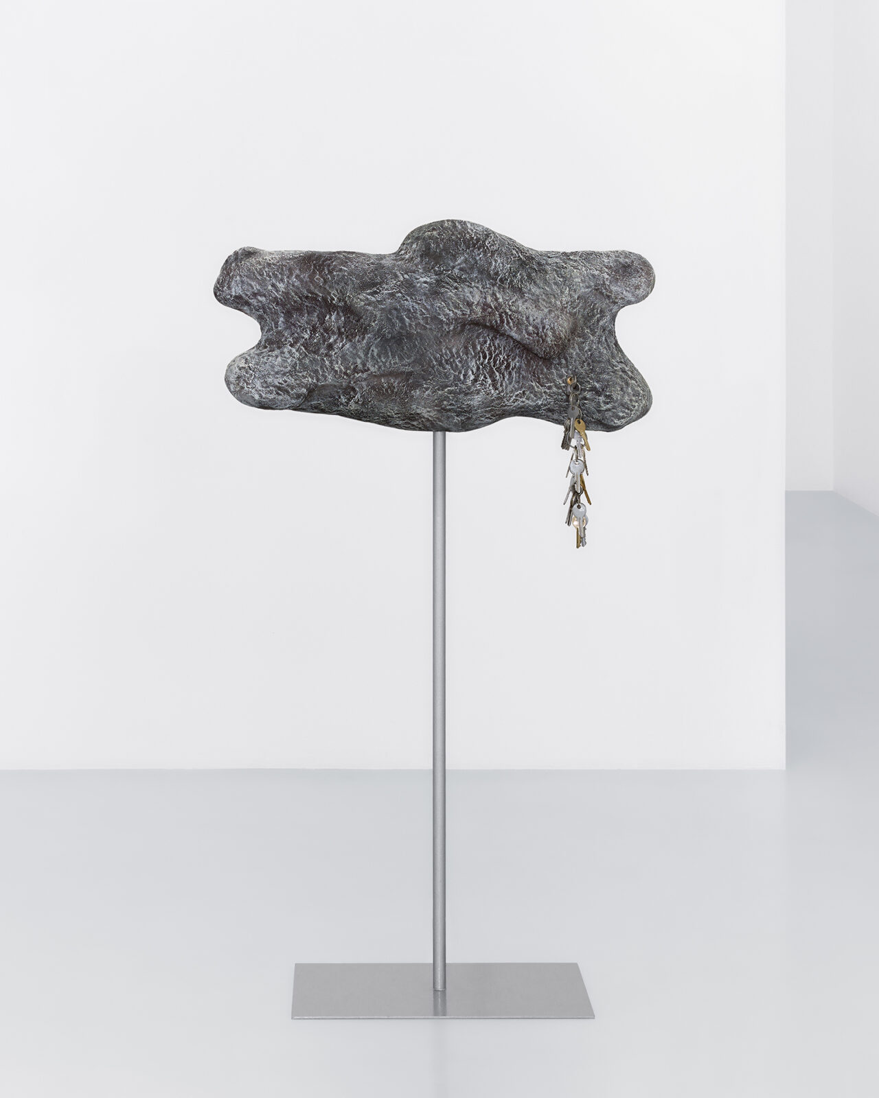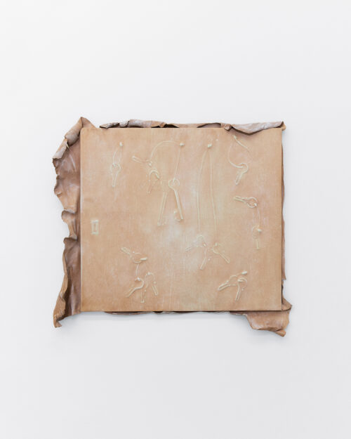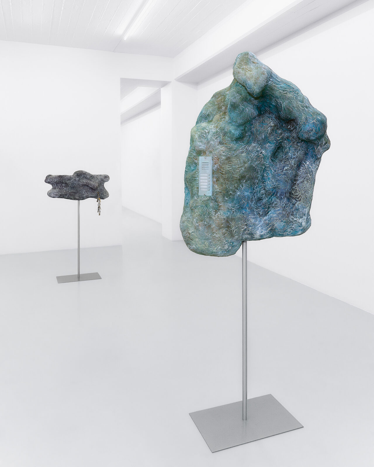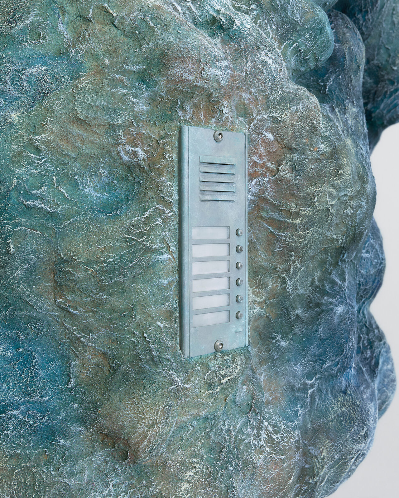 Mickiewicz’s process generates the core of the pieces: she begins with a search for mountainous, rocky locations with sculptural quality and intrigue. Staying in these locations for extended periods, Mickiewicz absorbs their characteristics, both tangible and intangible, then, at last, seeks out fragments to capture the essence long after she has departed. Then begins an extended silicone moulding process, casting the elements which become the formal pulsing hearts of the works. In releasing the mould days later, peeling away a thin layer that preserves the imprint of a place at a particular moment [1], revealing the concrete and ephemeral embossments of said loci. As Mickiewicz sculpts, she combines various moulds with representative materials; whether felt, steel, plaster, fibre-glass, or leather, the mediums are chosen intuitively in connection with the textures and shapes of the original physical landscapes. Each sculpture thus evolves into a modular, faceted being, a final abstract entity constituted from specific forms. The symbols of thresholds adorning the works––found door handles and latches, intercoms, keys, and locks––are representative of the marked boundaries between public and private, another topographical dichotomy key to Mickiewicz’s practice. Through elevating daily tools of access to ornamental foci, these symbols lead us to pause on the daily traversal between the ostensibly distinct poles.